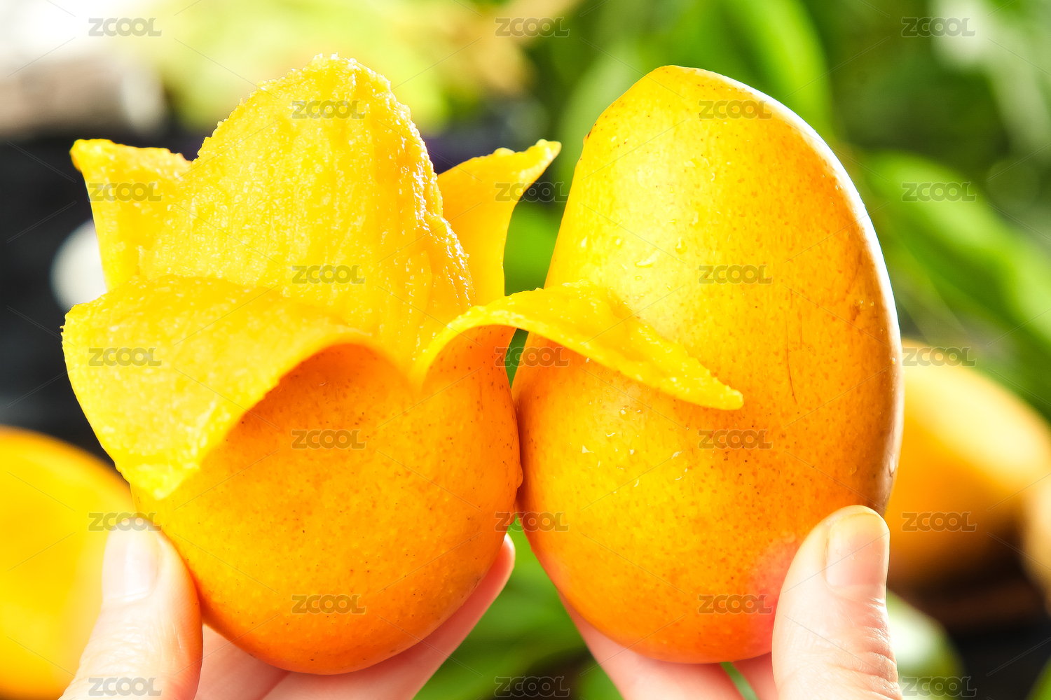 双手上拿着一个小台芒和一个撕开皮的小芒果