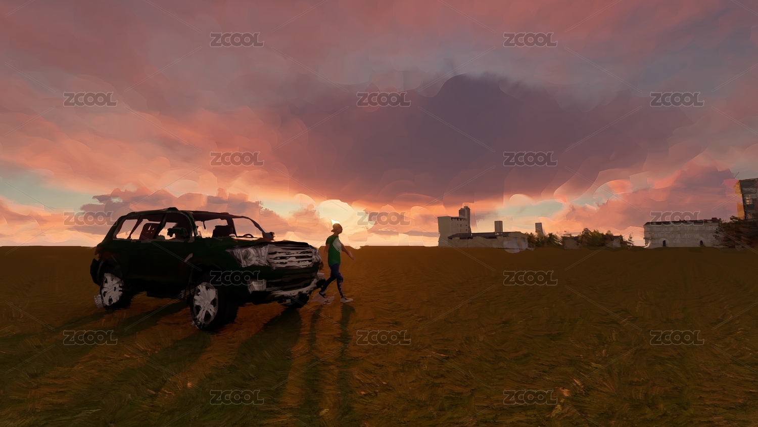 夕阳下吉普车和男孩涂抹风格