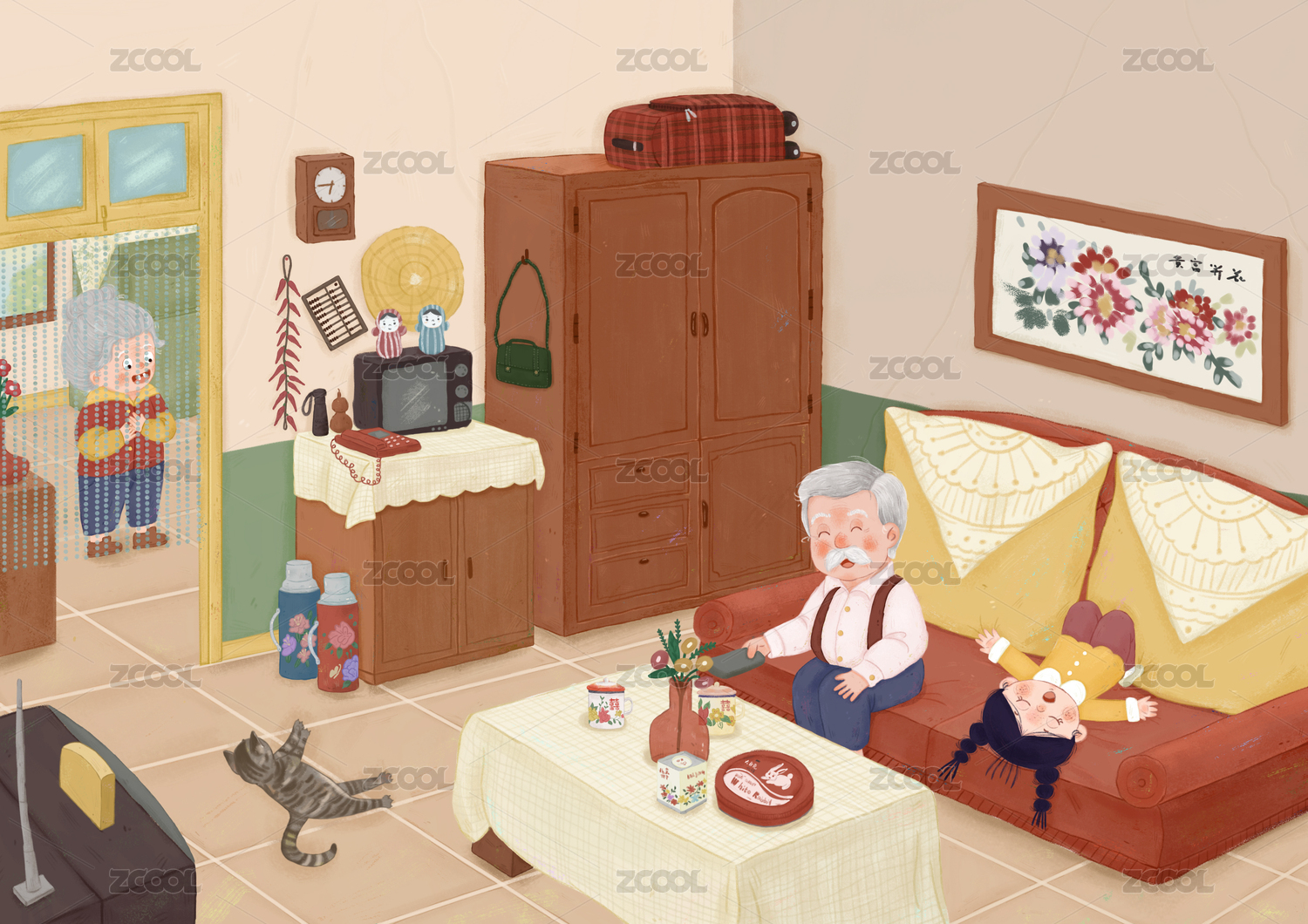 小伙伴小朋友吃西瓜纳凉扇子雪糕插画怀旧