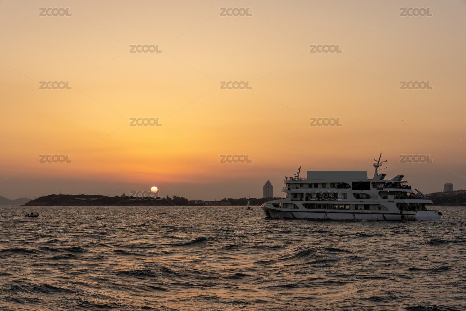 乘坐游艇在平静的海面上进行宁静的日落巡游