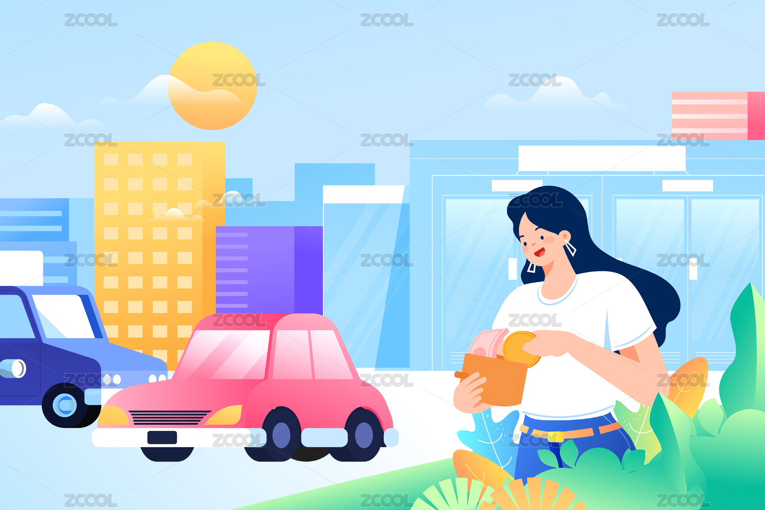 卡通环保低碳出行自行车交通出行方式垃圾分