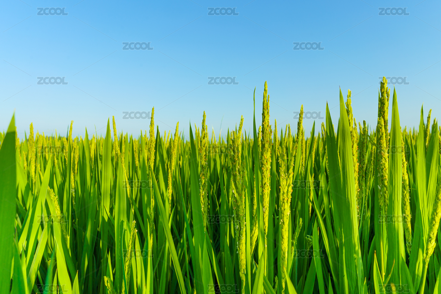 晴天插满秧苗的水田旁边一颗绿树成荫的大树