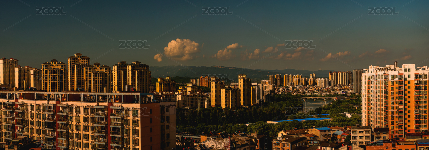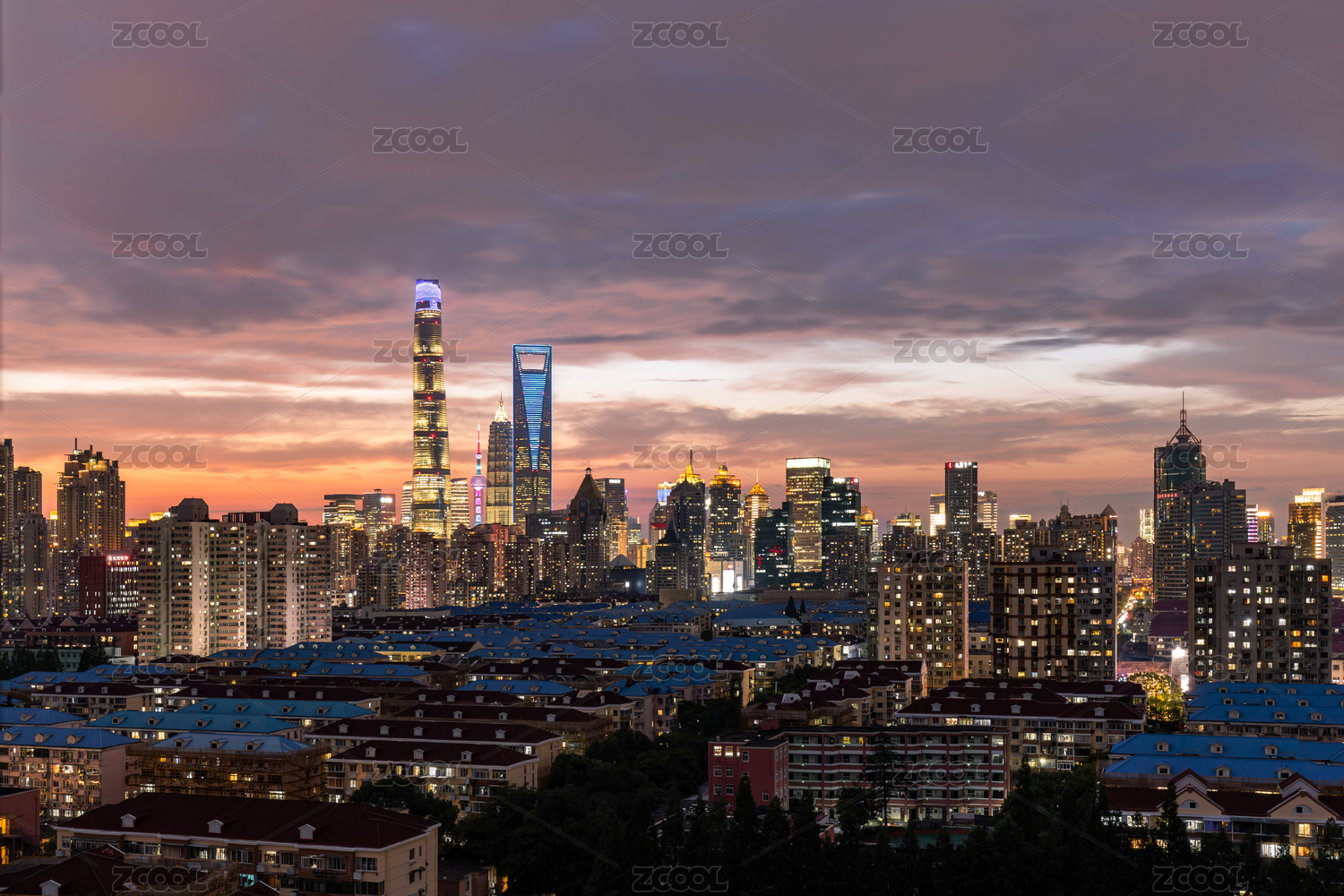 晚霞中华灯初上的陆家嘴摩天大楼和居民楼
