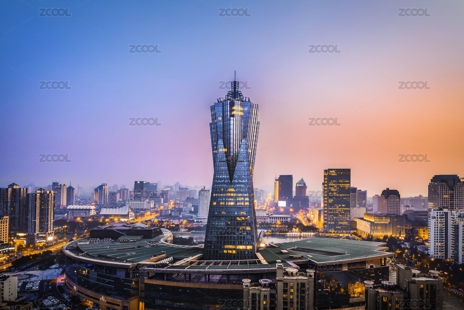 华灯初上时以晚霞为背景的上海陆家嘴风光,中国上海