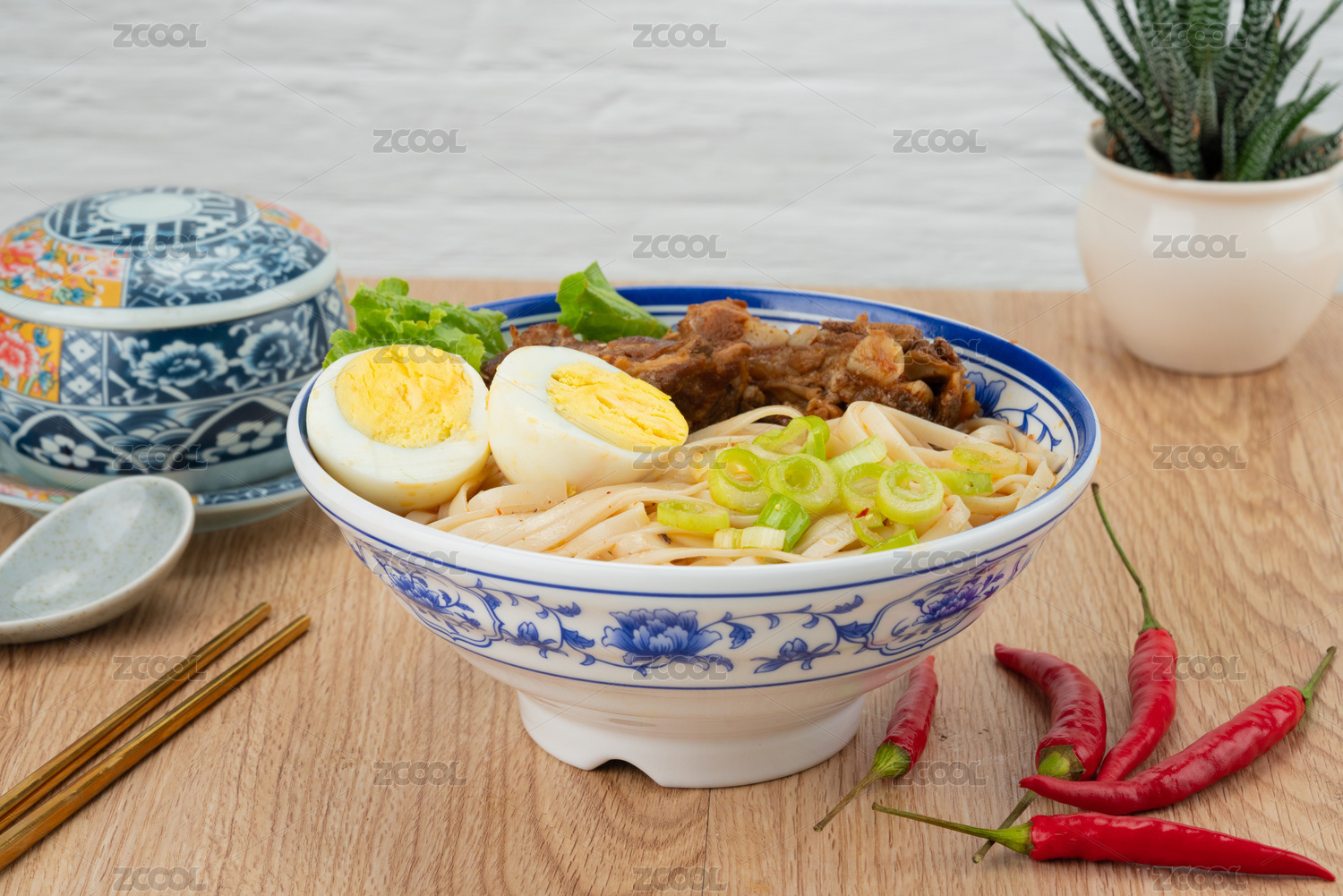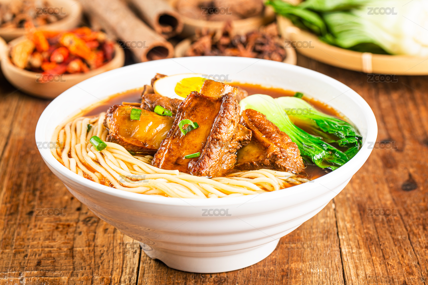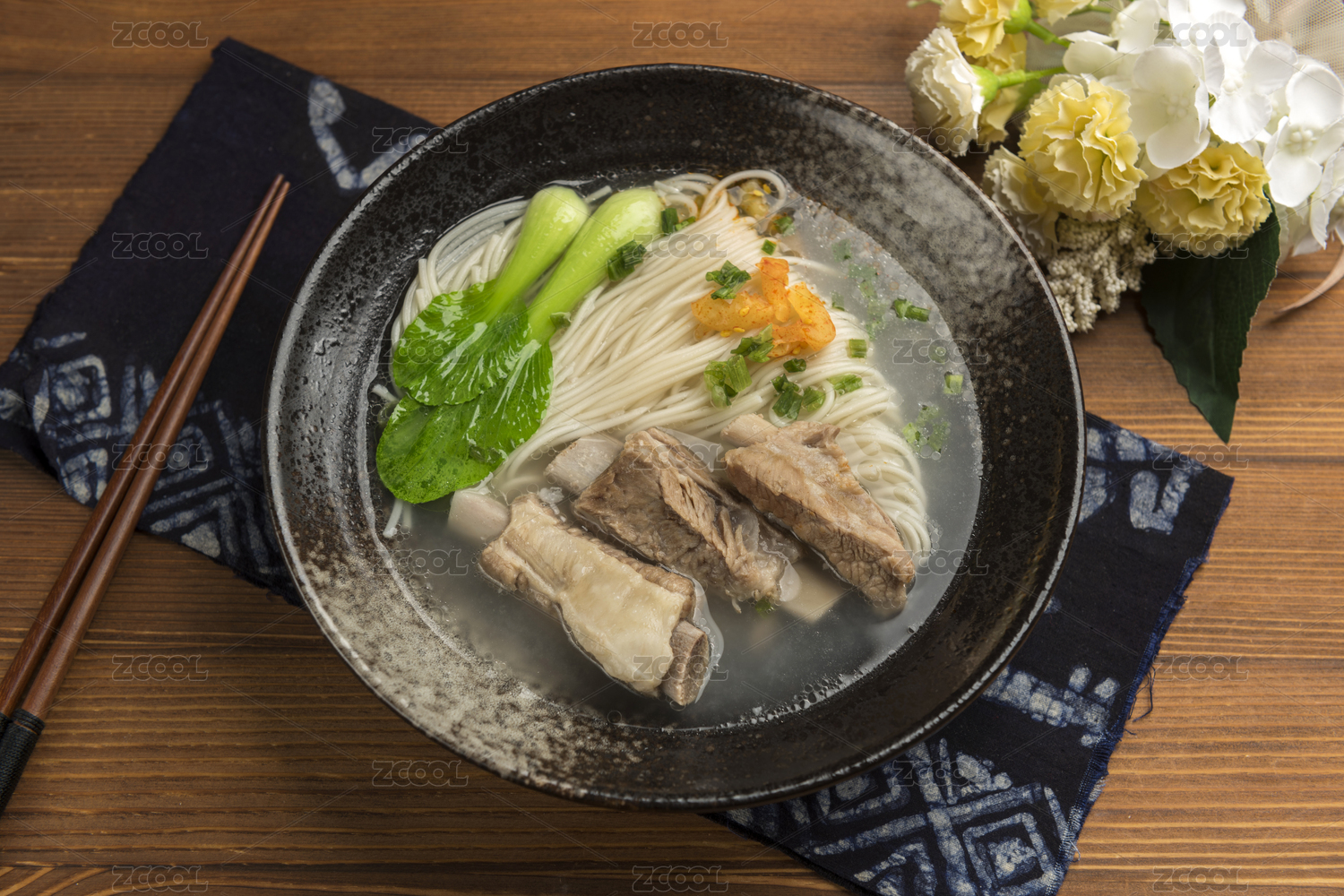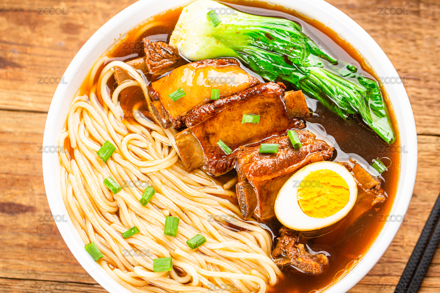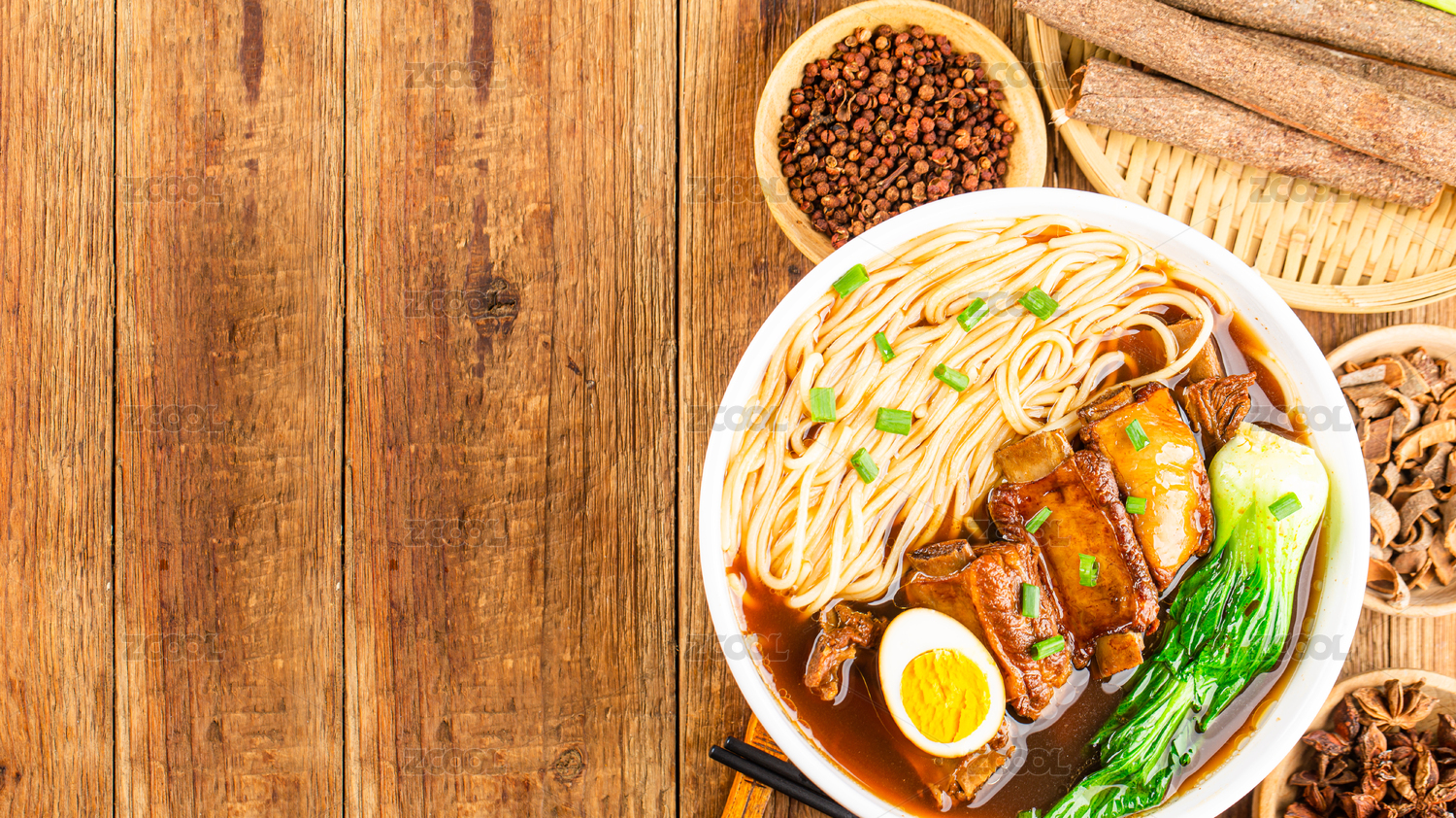 一碗排骨面摆放在木桌面上特写