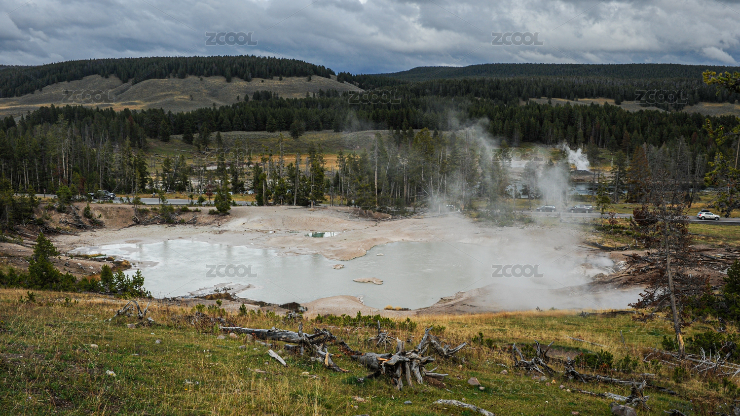 远处眺望美国黄石公园大棱镜湖岸边