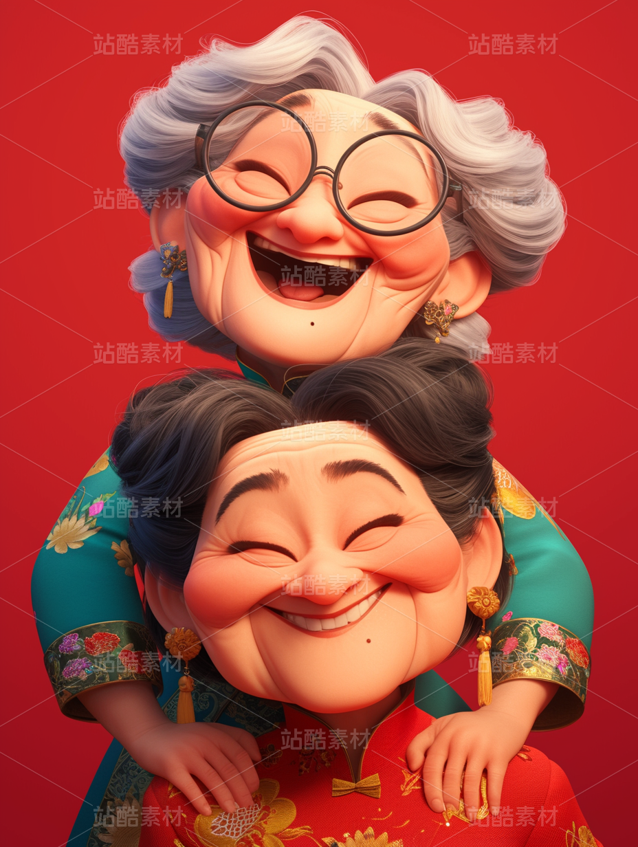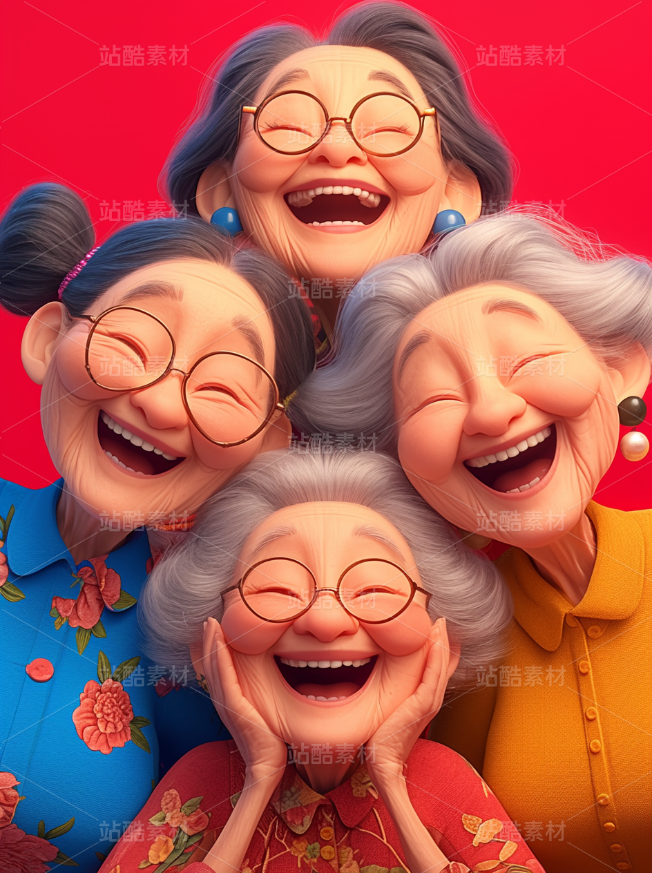 彩色3D卡通人物老年人老奶奶友谊开心幸福
