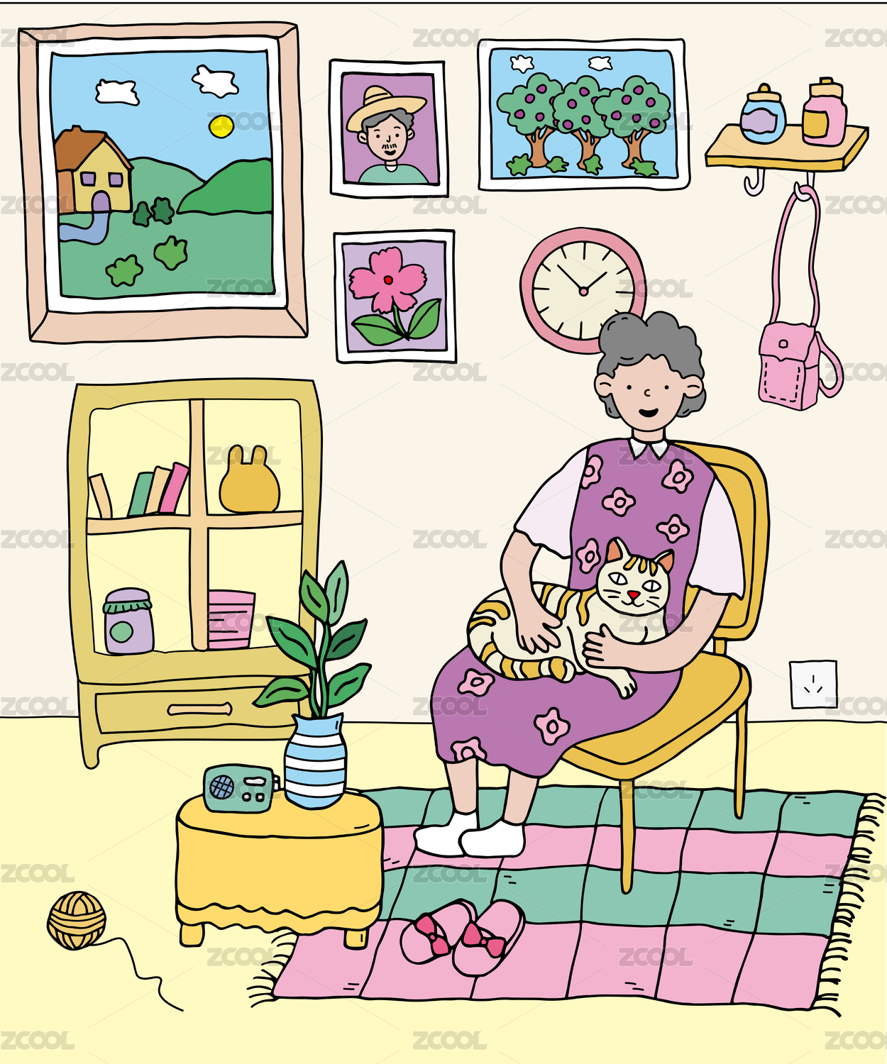 坐在沙发上抱着猫睡着的老奶奶—重阳节插画