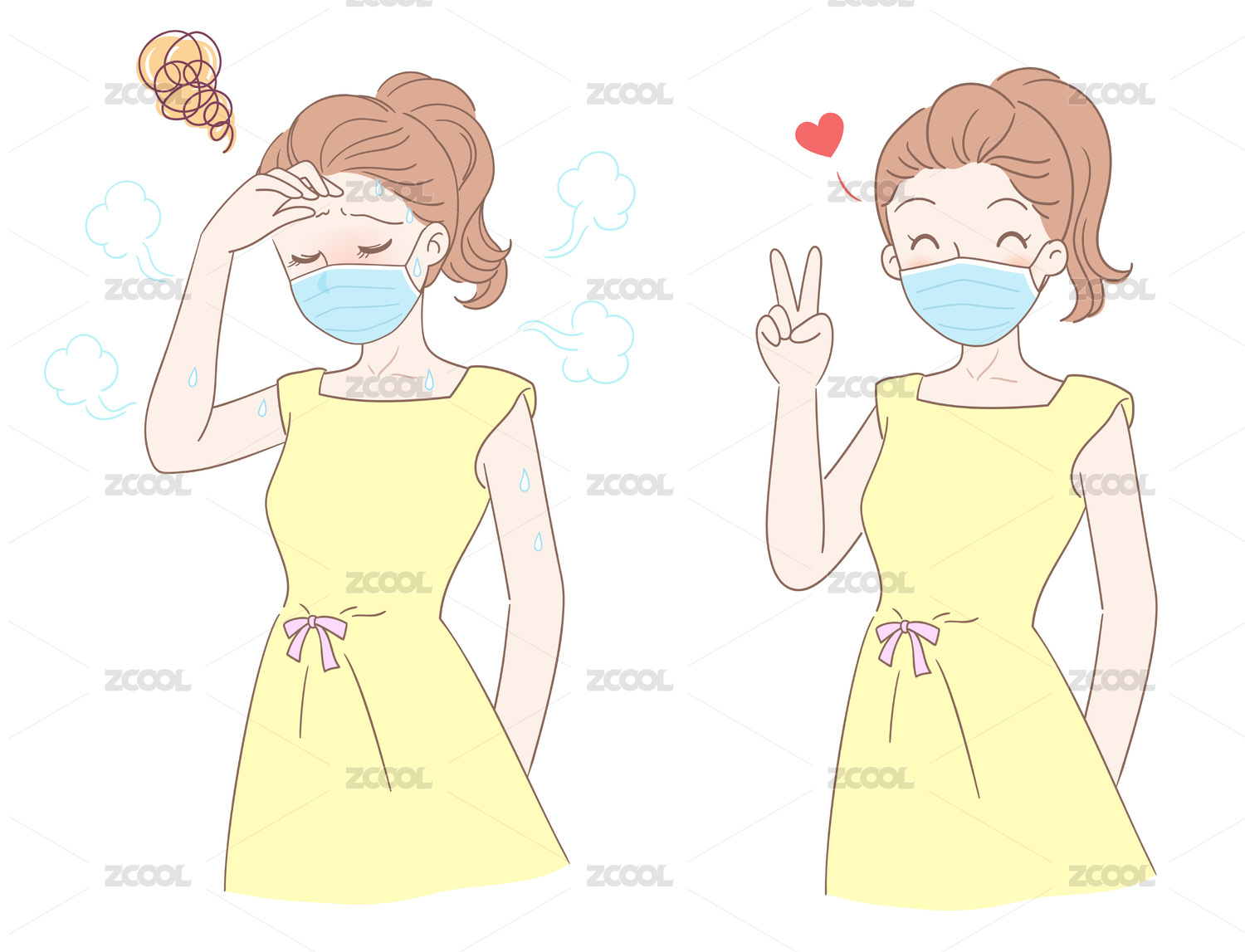 戴口罩的女人闷热出汗与开心自在的对比