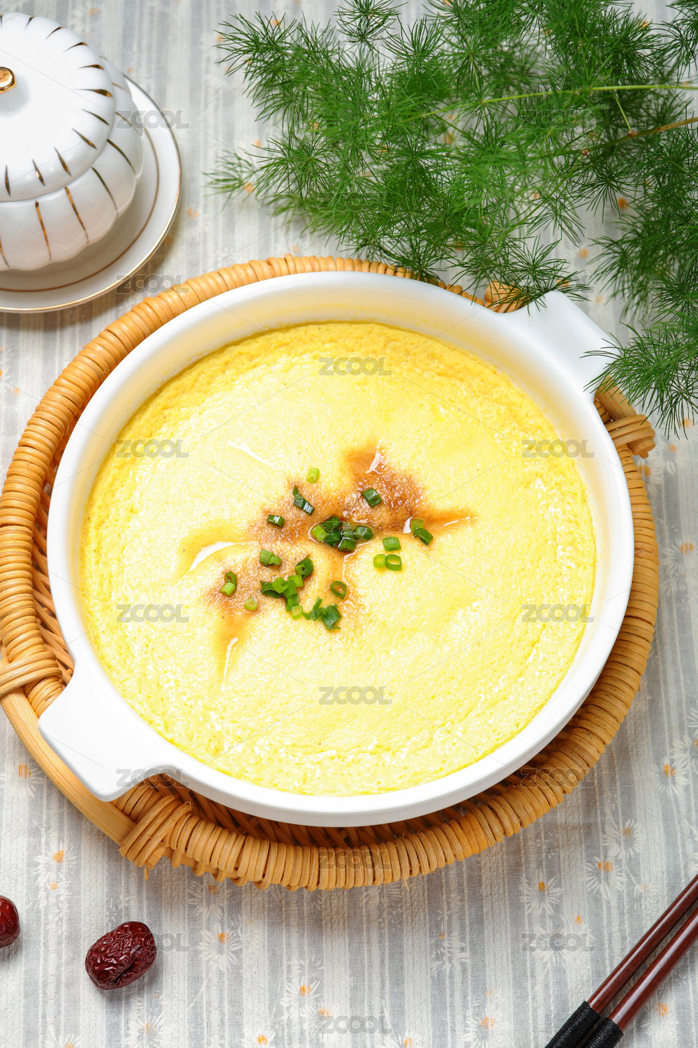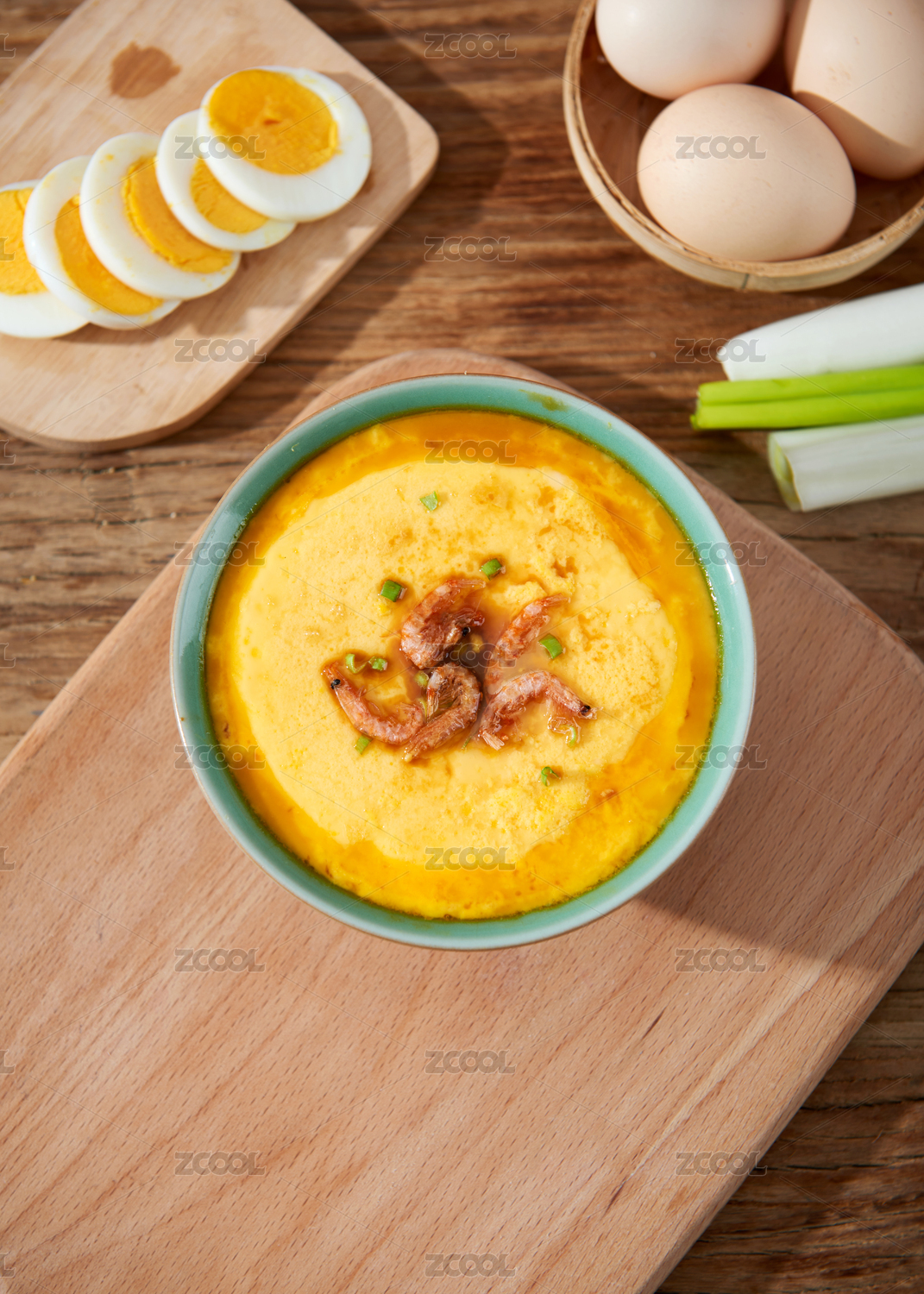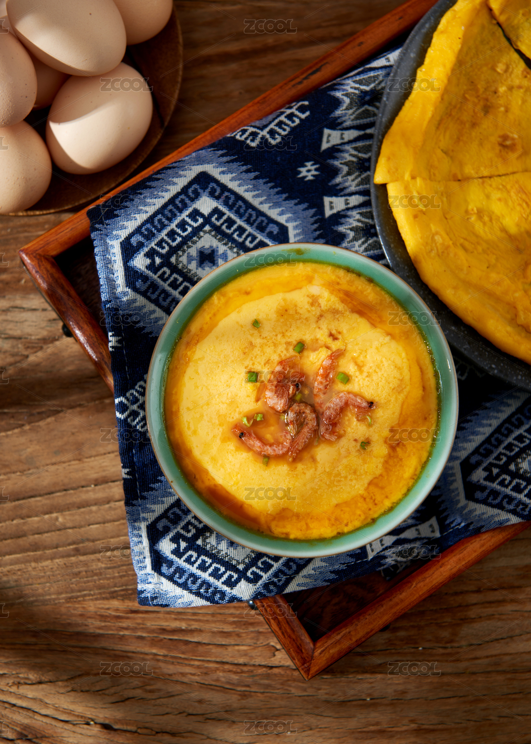 桌上碗里的鸡蛋羹高角度视图