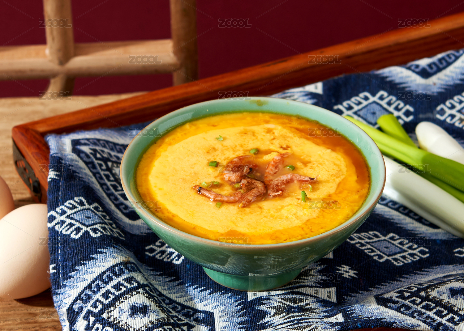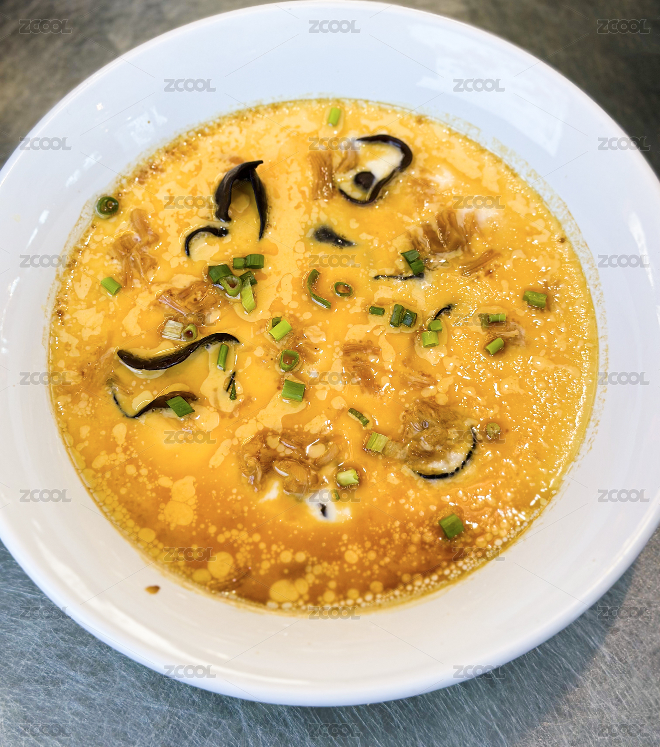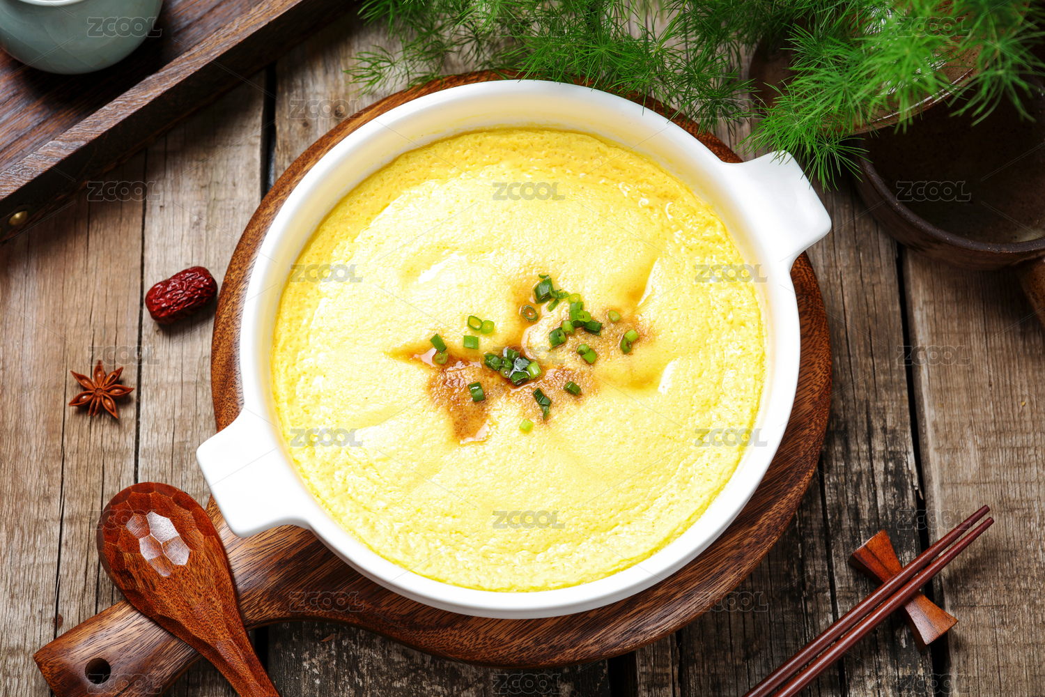 桌上碗里的鸡蛋羹高角度视图