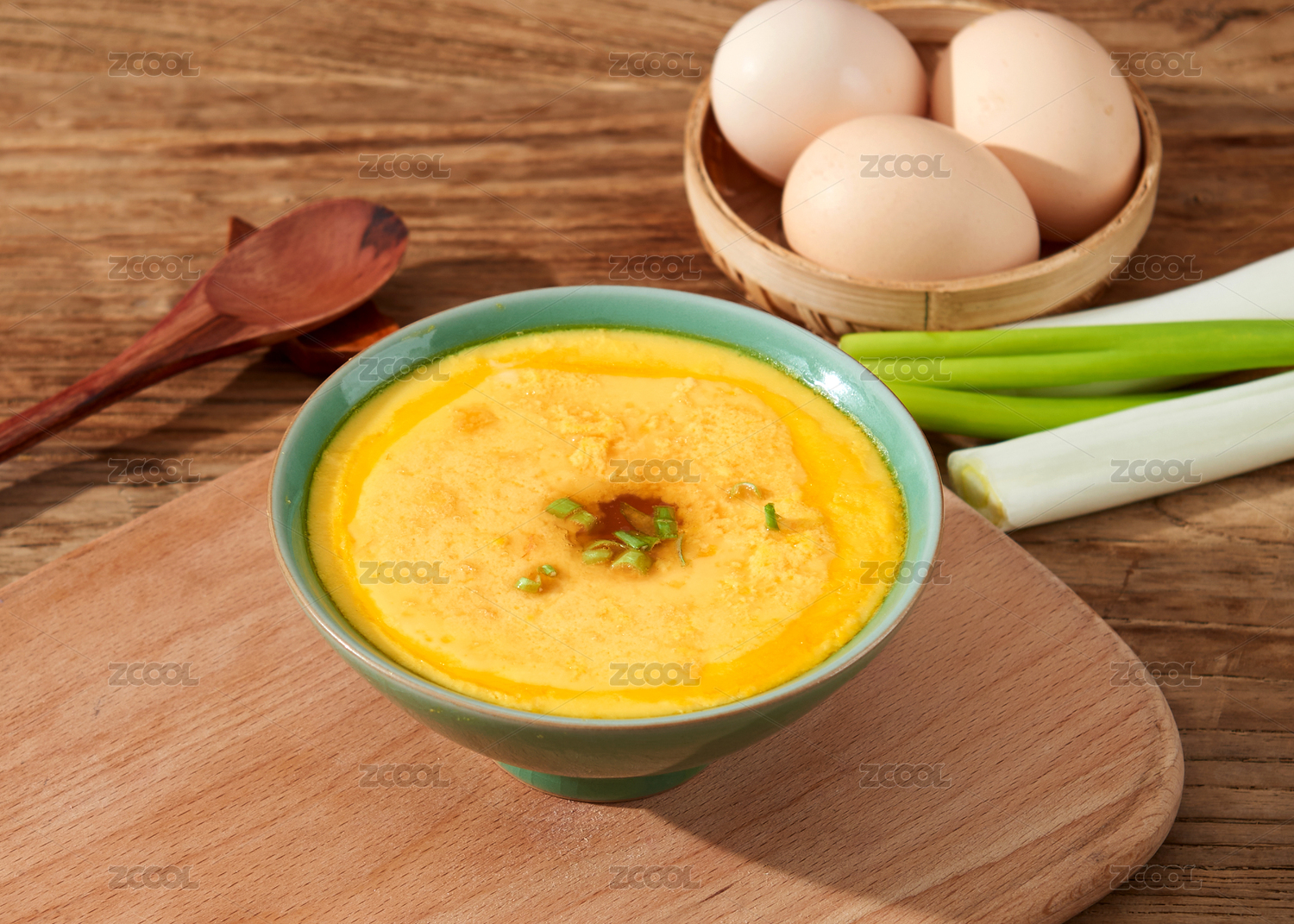 深底上放着一碗香葱鸡蛋羹和勺子上挖着鸡蛋