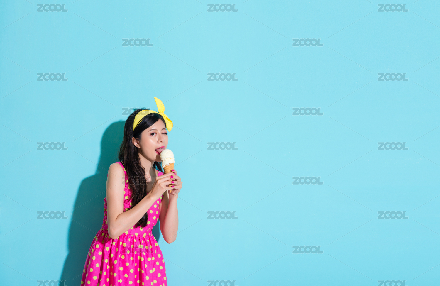 可爱优雅的女人眨眼的眼睛看着摄像机,享受唇形蓝色背景上的美味的冰淇淋地位。