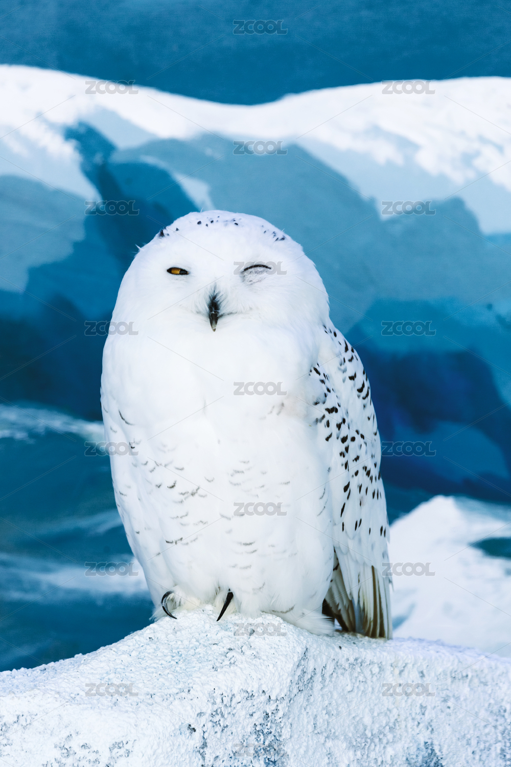 一只对镜头眨眼的可爱雪鸮全身照