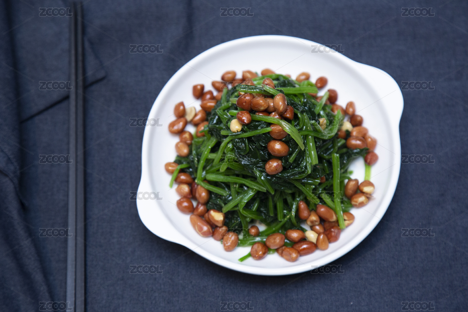 放在深色餐布上的一盘中国传统家常凉拌菜 — 凉拌菠菜花生