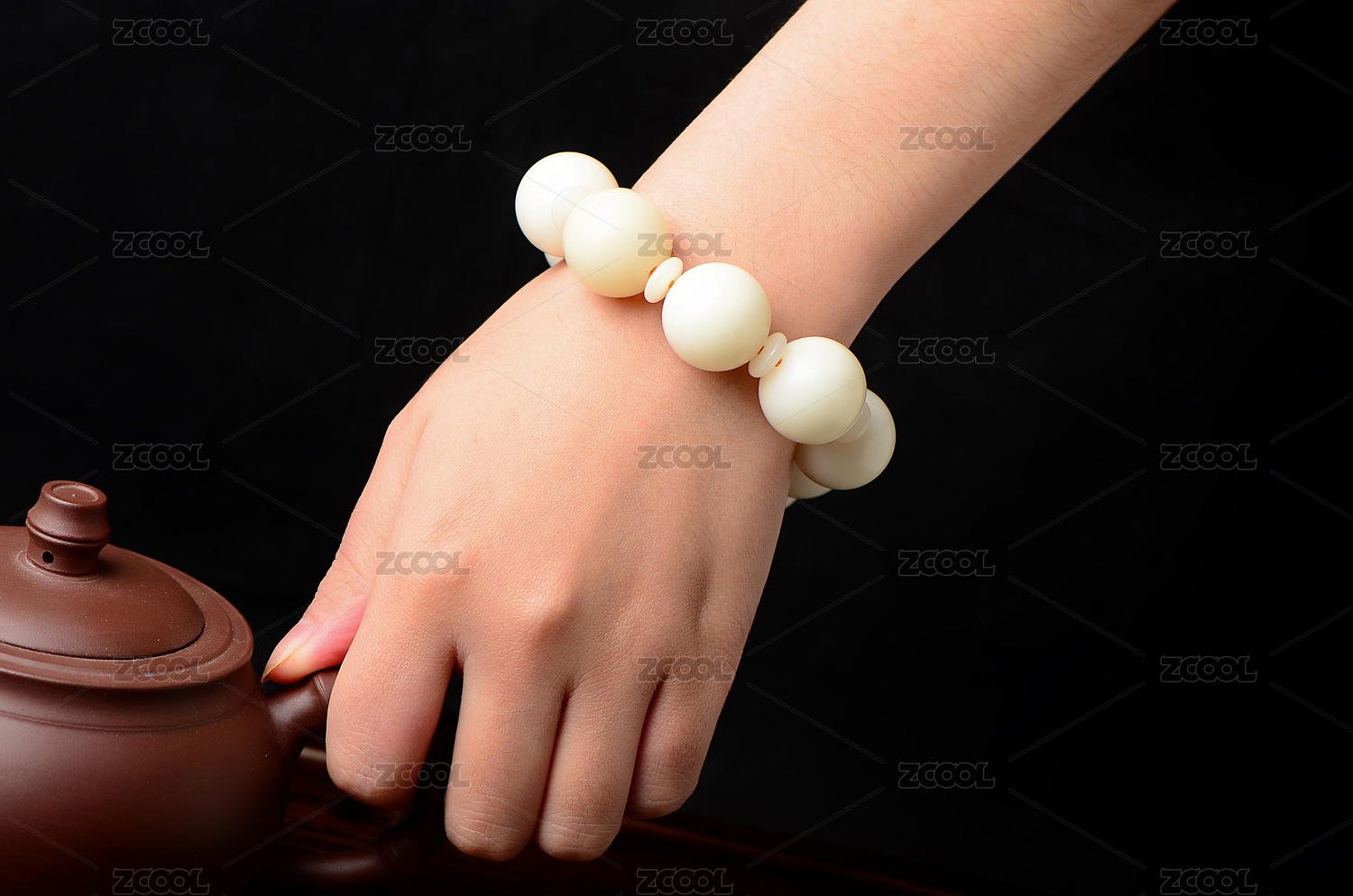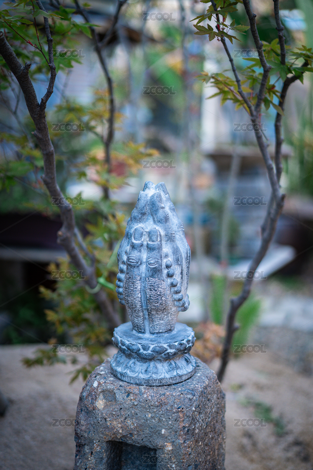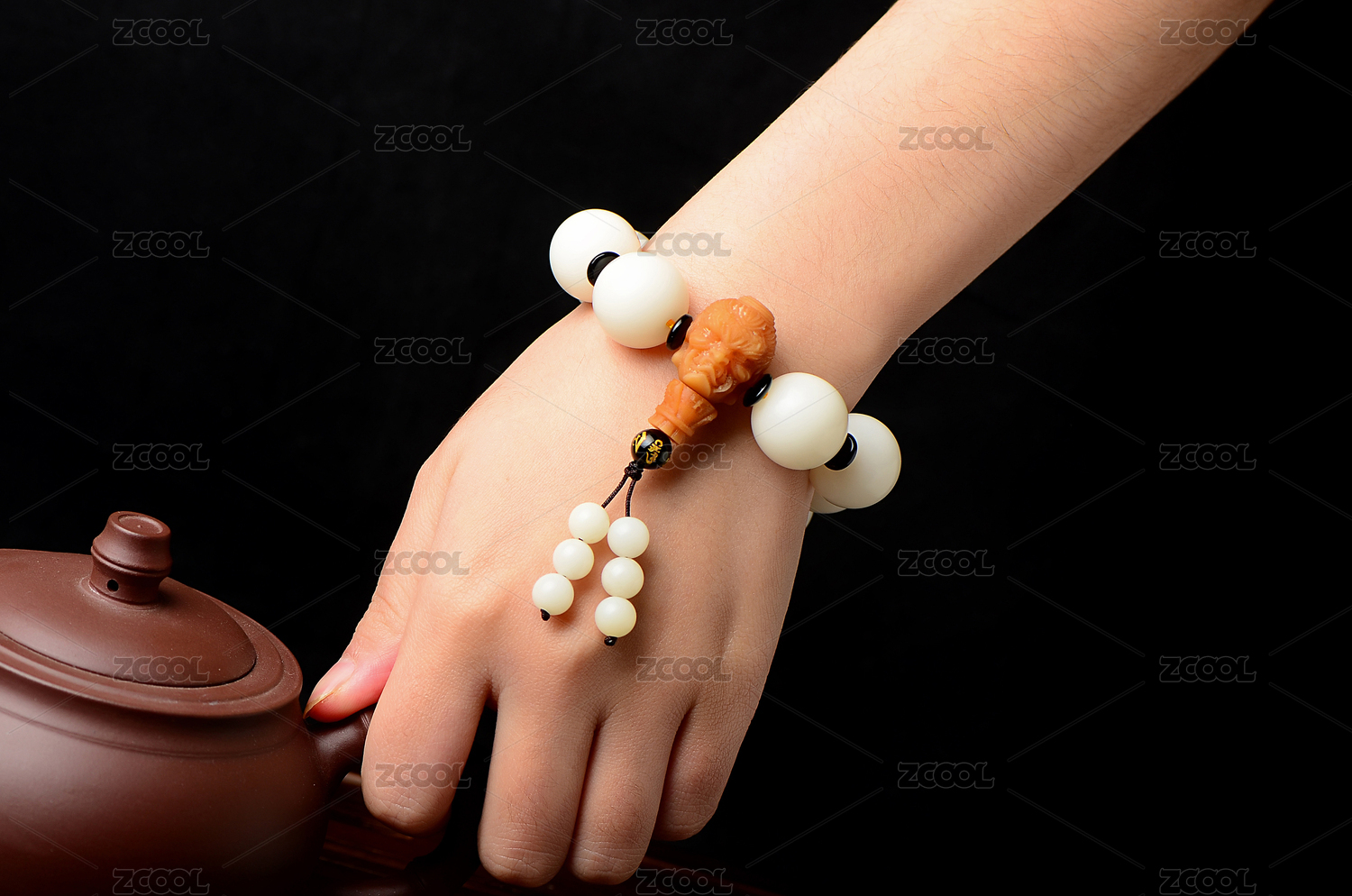 中式庭院内大理石手捻佛珠的双手特写