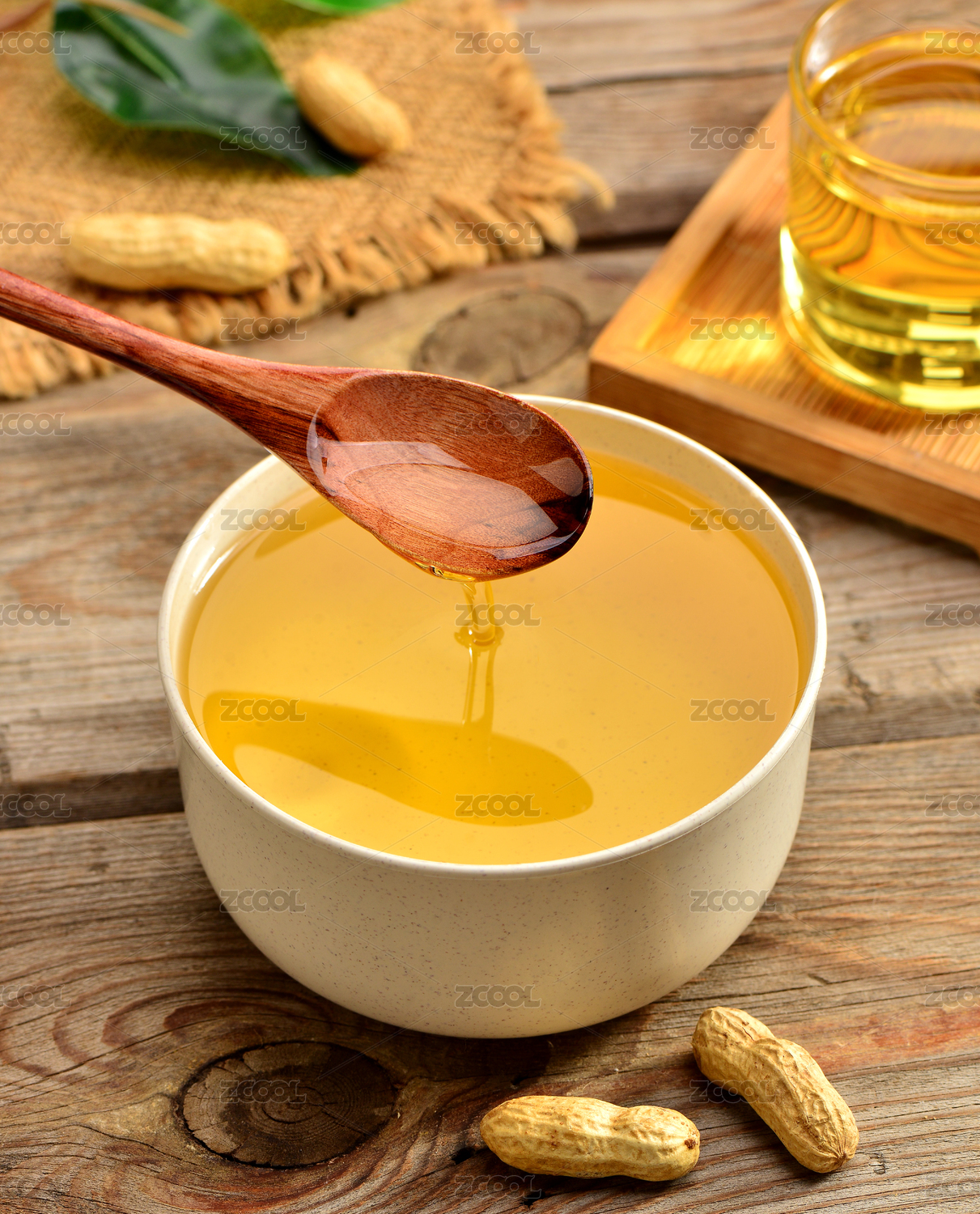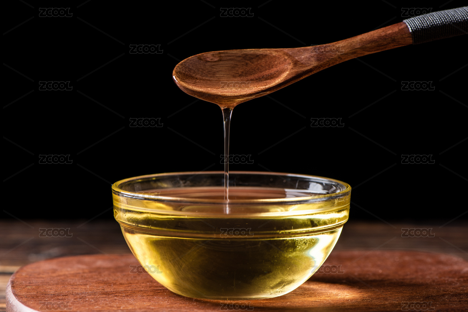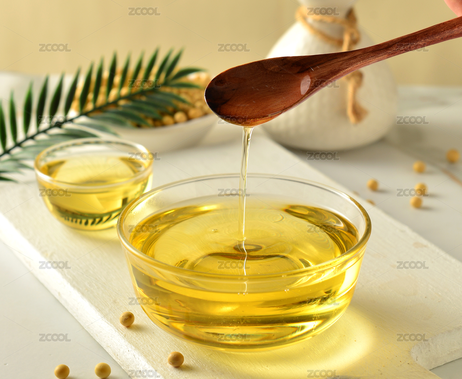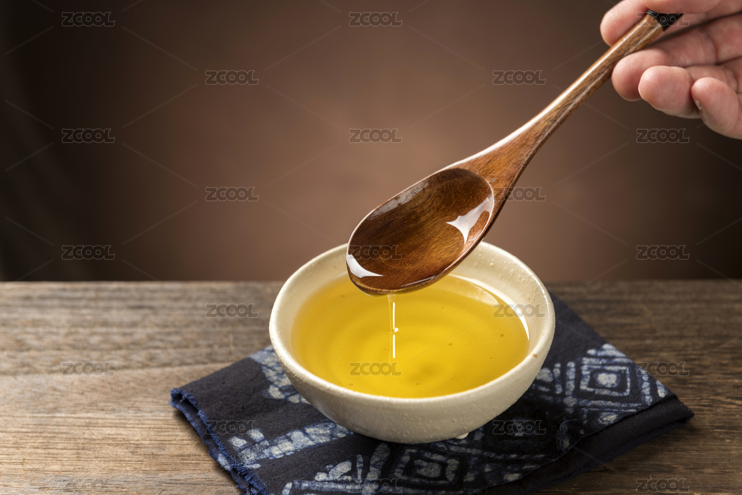 深底上放着一碗黄豆油和勺子上挖着食用油