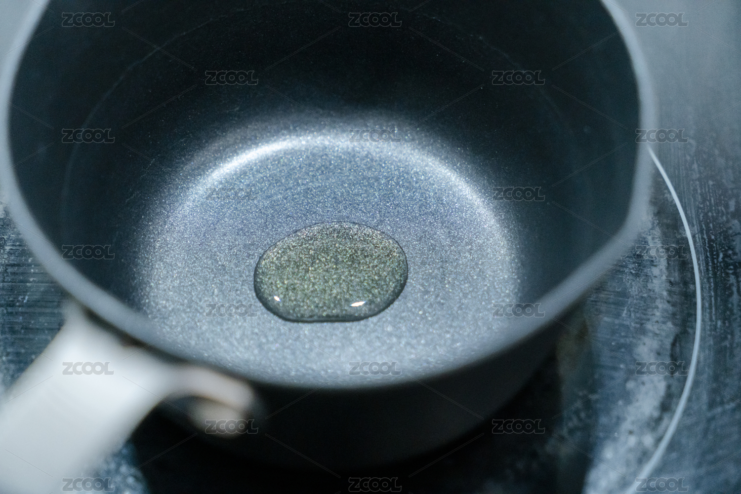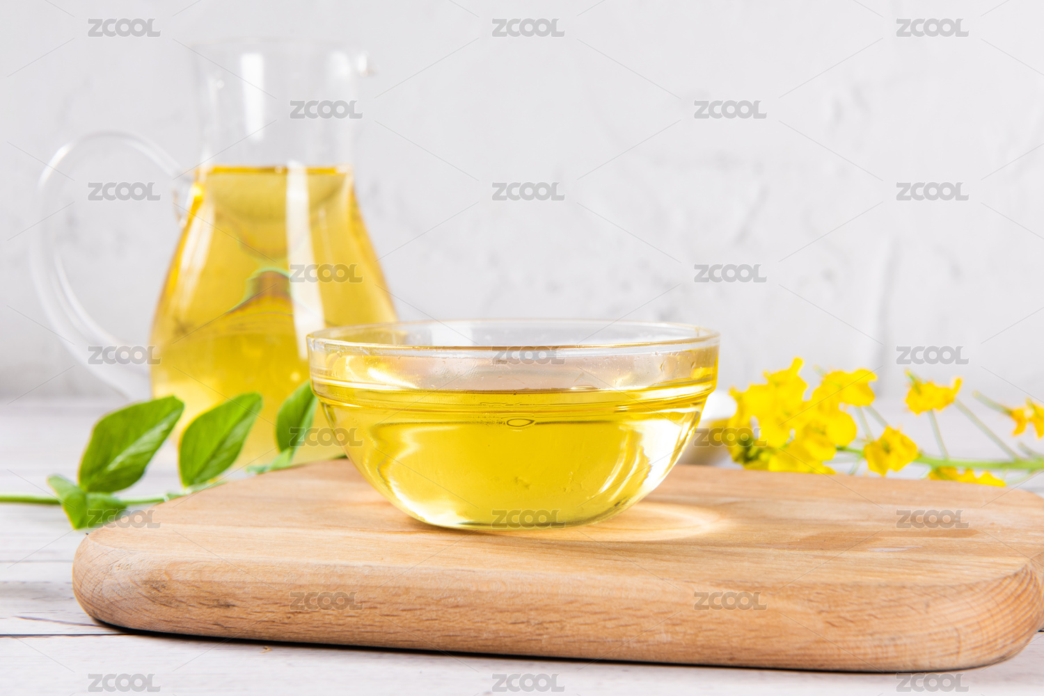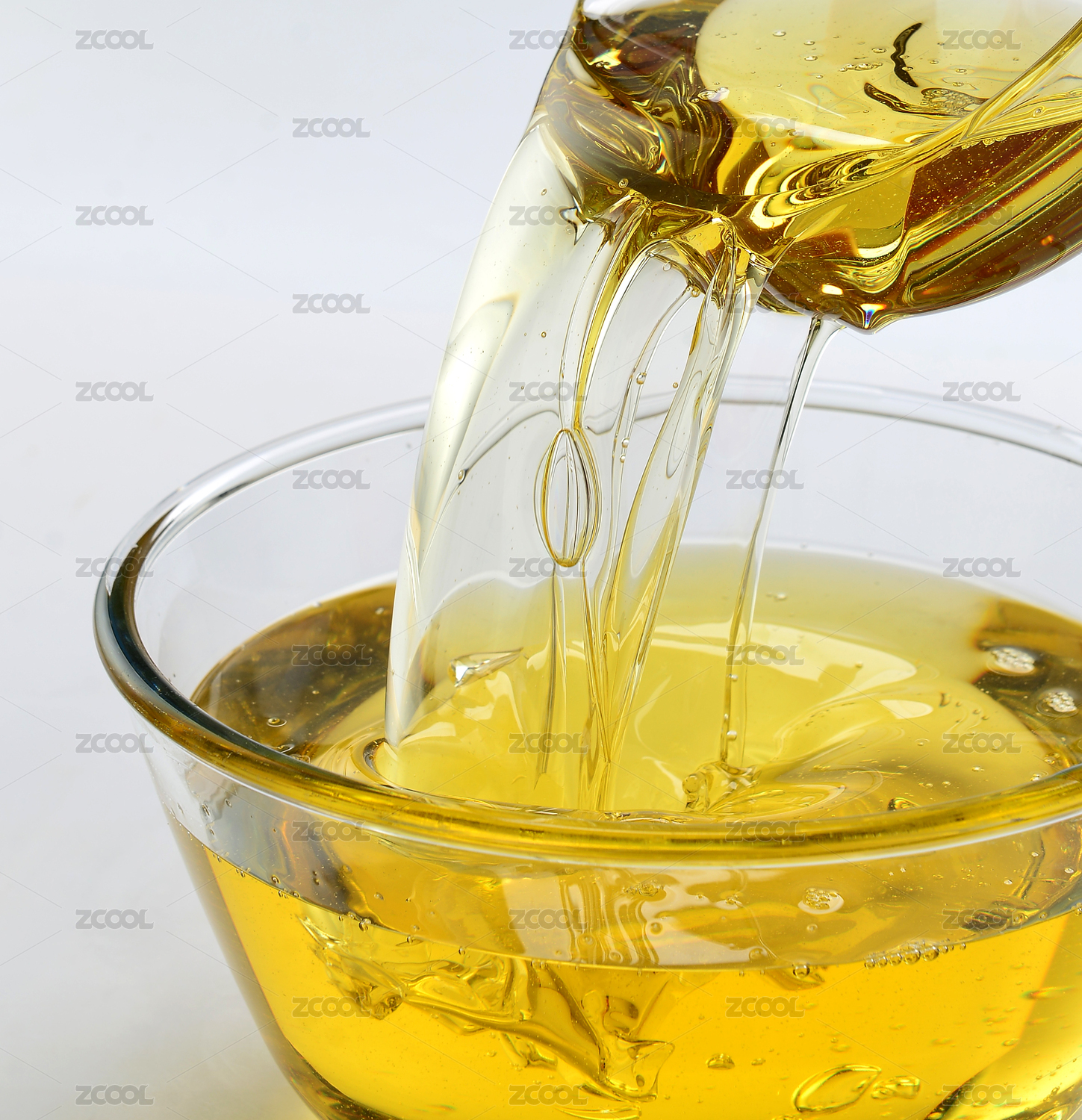 深底上放着一碗黄豆油和勺子上挖着食用油
