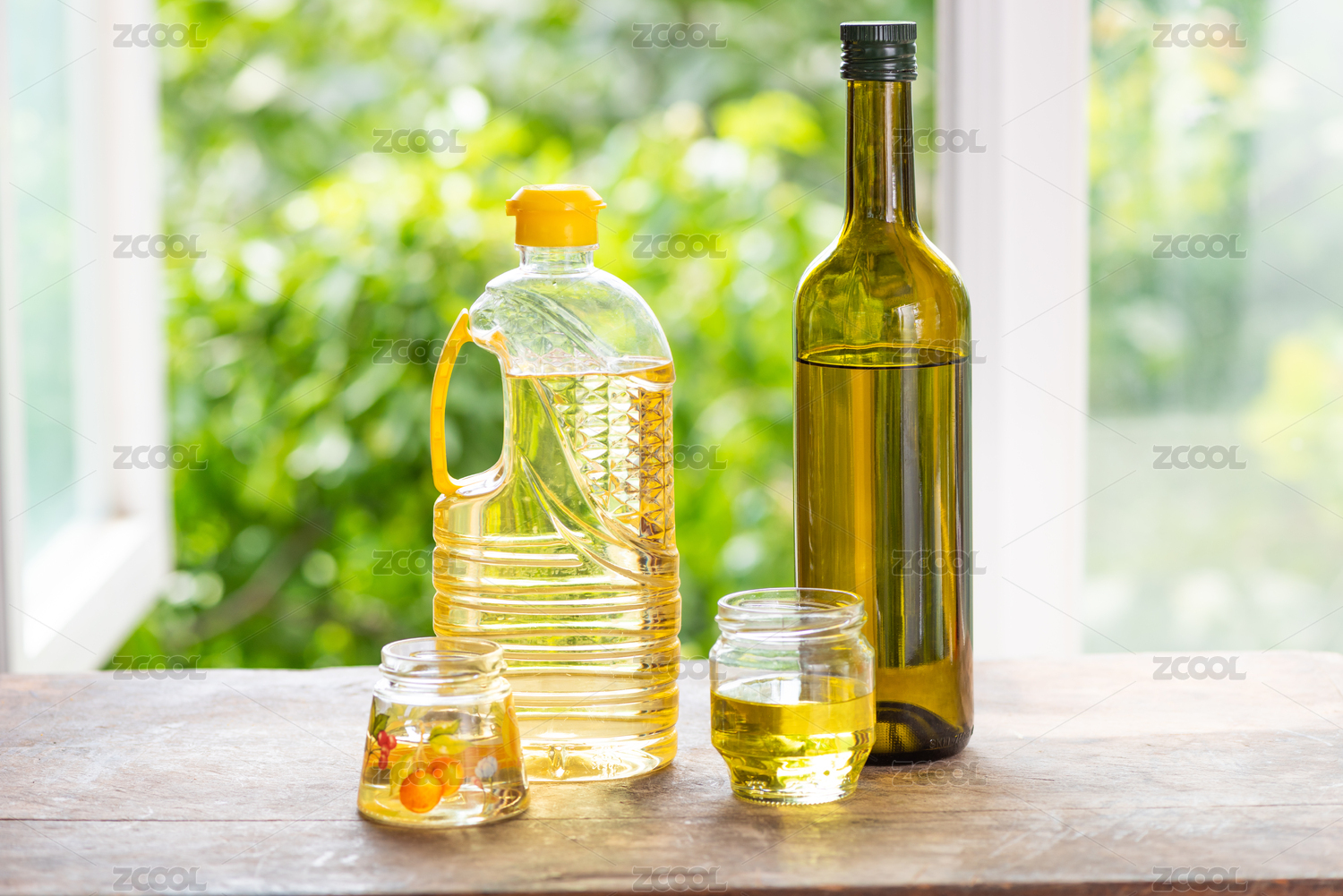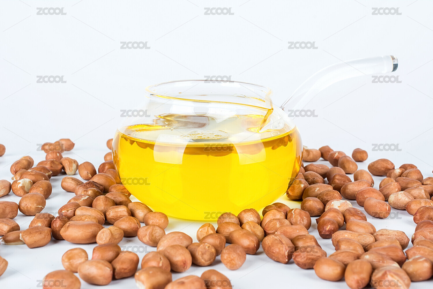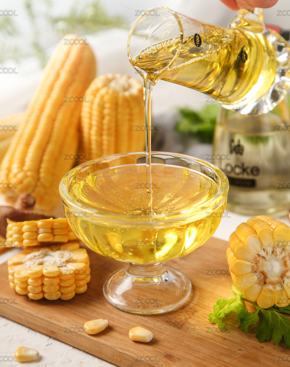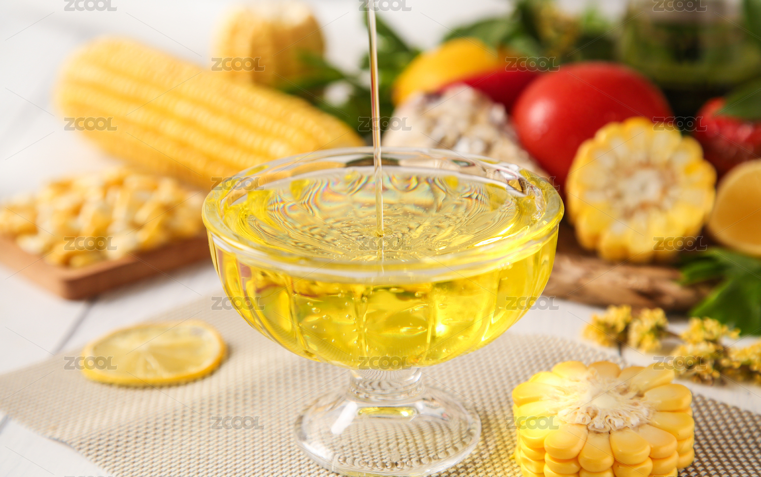 深底上放着一碗黄豆油和勺子上挖着食用油
