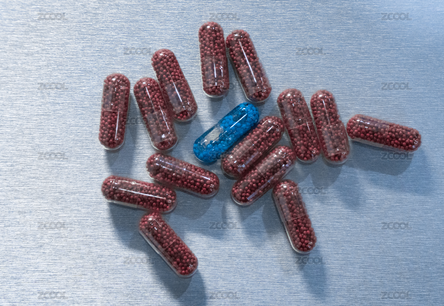 散落在金属质感桌面上的蓝色和红色胶囊
