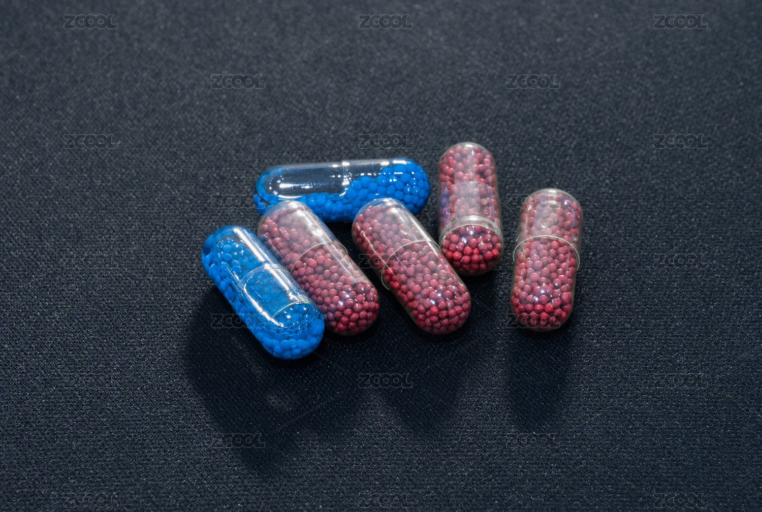 黑色桌面上的红色和蓝色胶囊特写