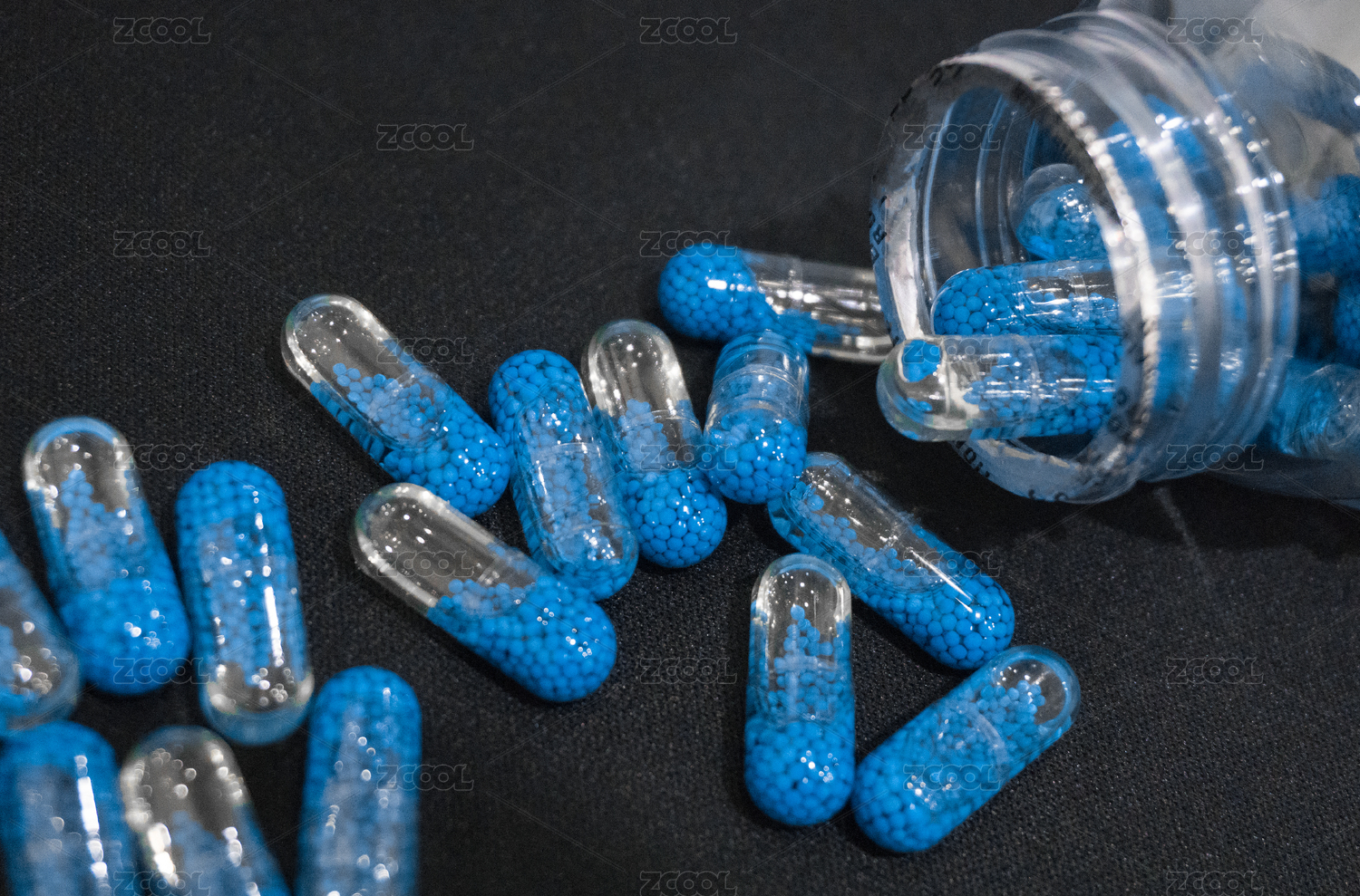 医疗题材的西药药瓶和有颗粒的胶囊的科技感海报背景