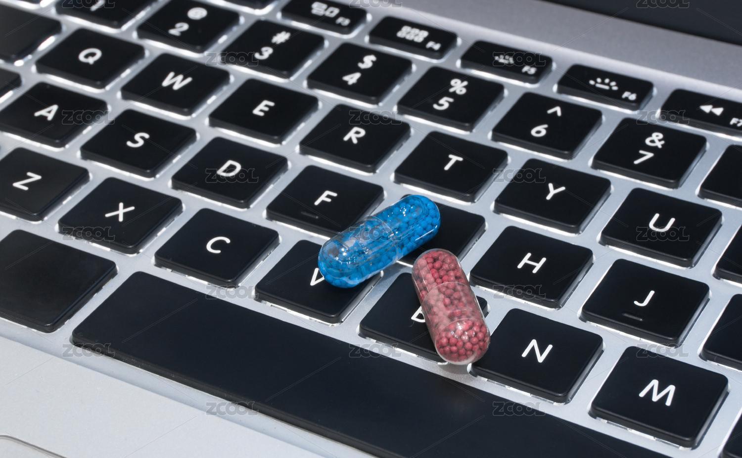 散落在键盘上的红色和蓝色胶囊