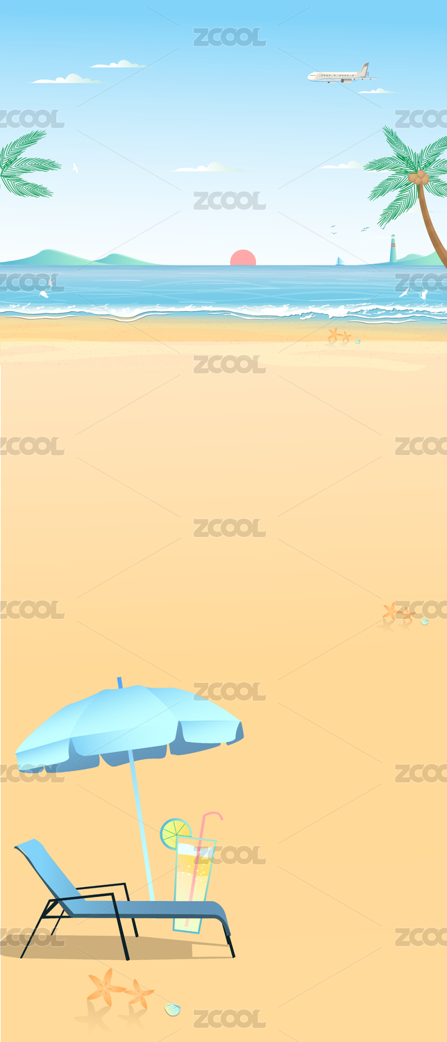 美丽的夏天,太阳照耀平静的蓝色海面,海浪在不断拍打着海岛岸边的细沙插画矢量海报
