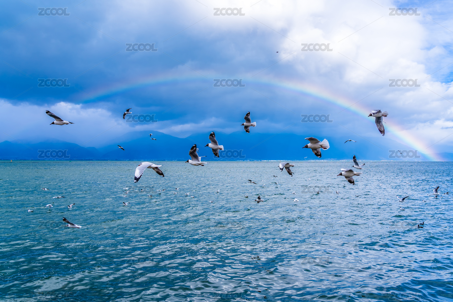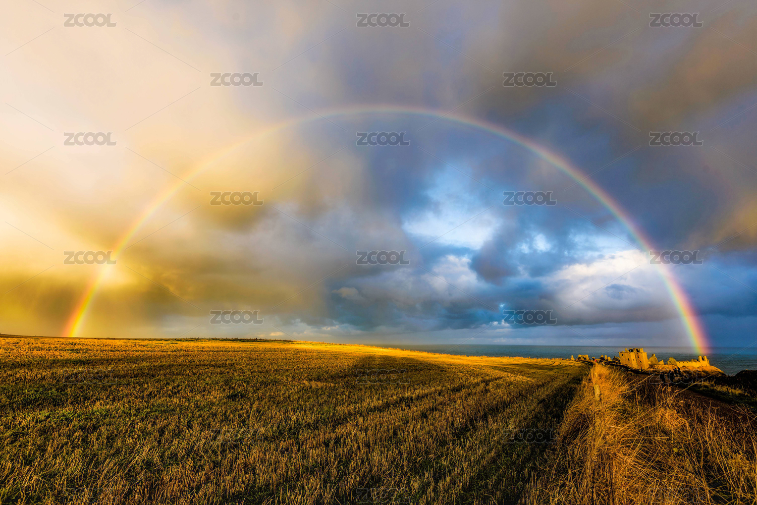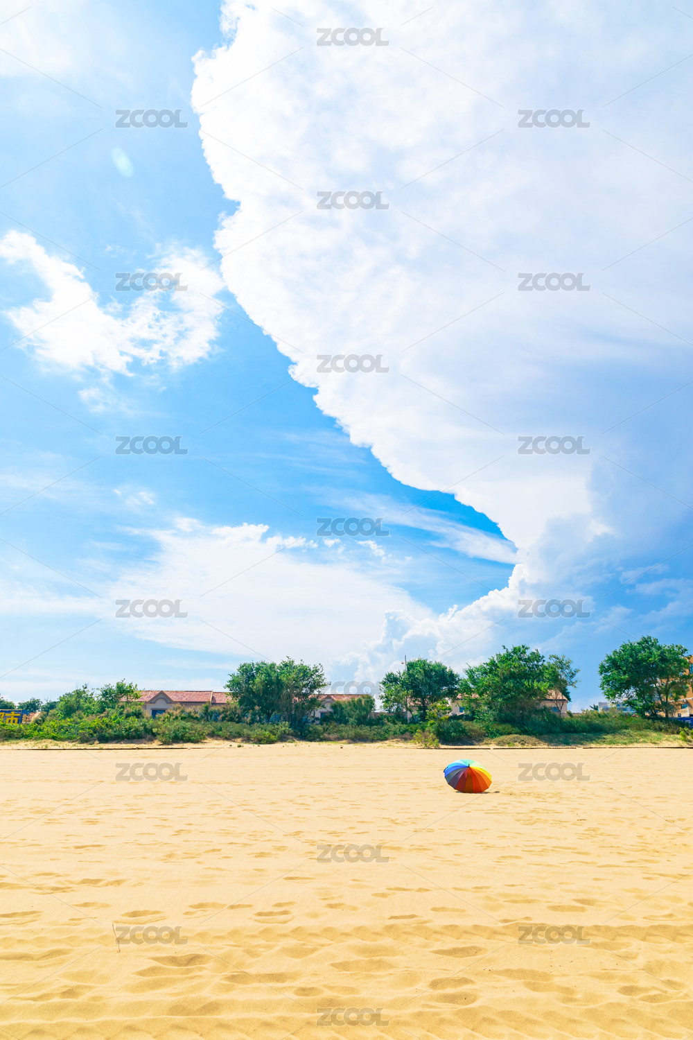 一把撑开的彩虹雨伞放在海边的沙滩上
