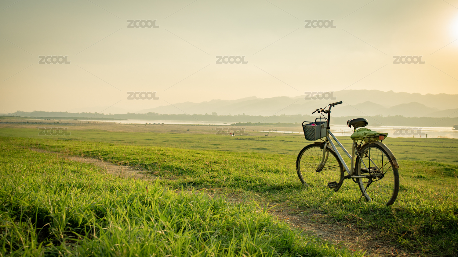 日落时分停靠在草地上的单车