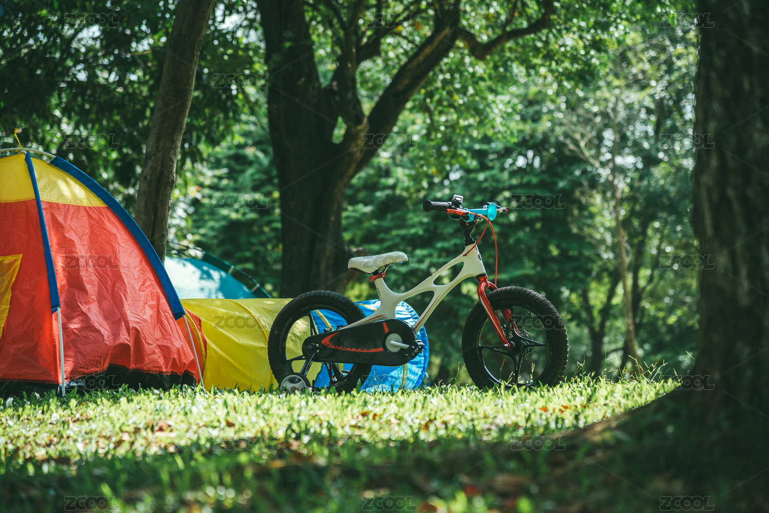 阳光草地上的帐篷和儿童单车