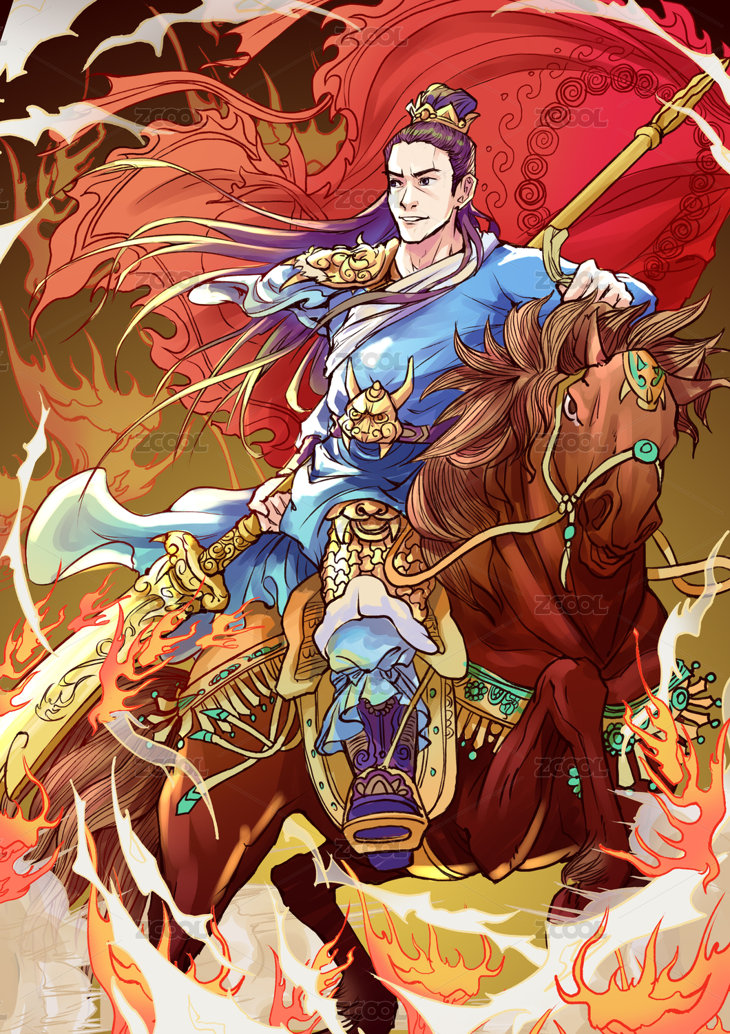 原创国潮古风骑马武将大刀将军插画
