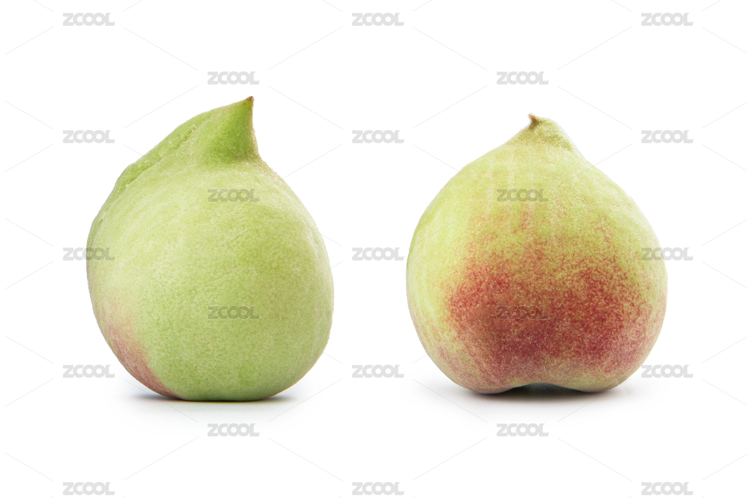 鹰嘴蜜桃和切开果肉带绿叶子白底
