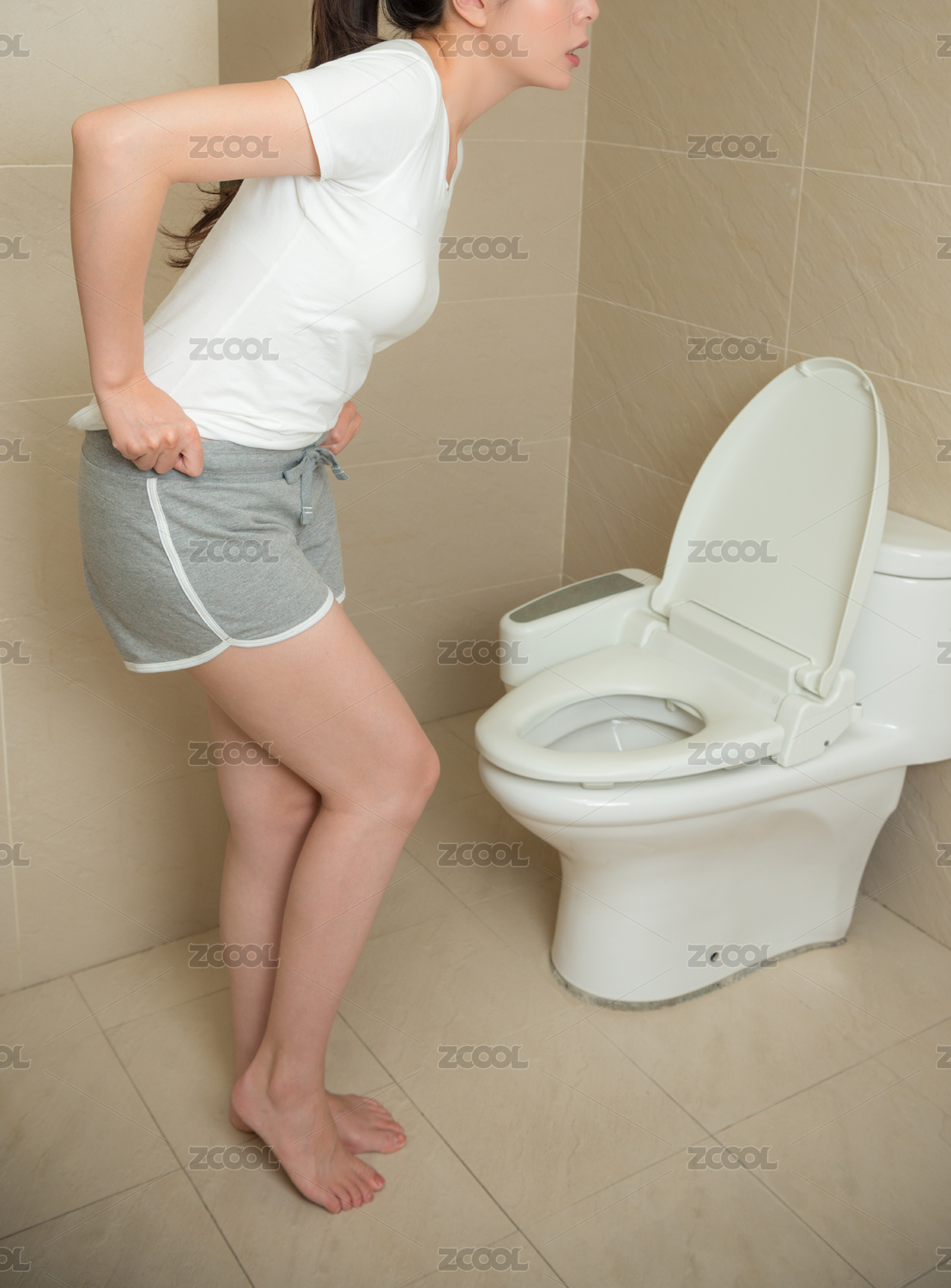 美丽可爱的姑娘站在浴室紧急起飞的,因为她感觉肚子疼裤子想腹泻进食后。