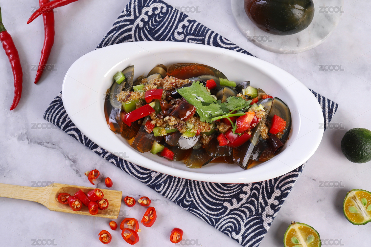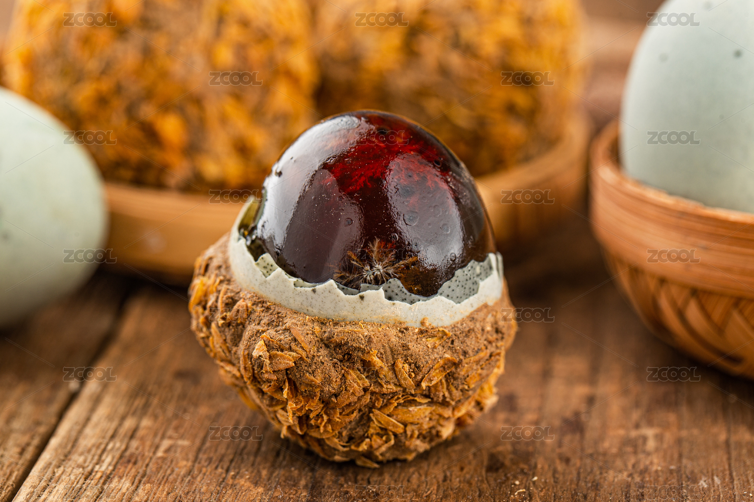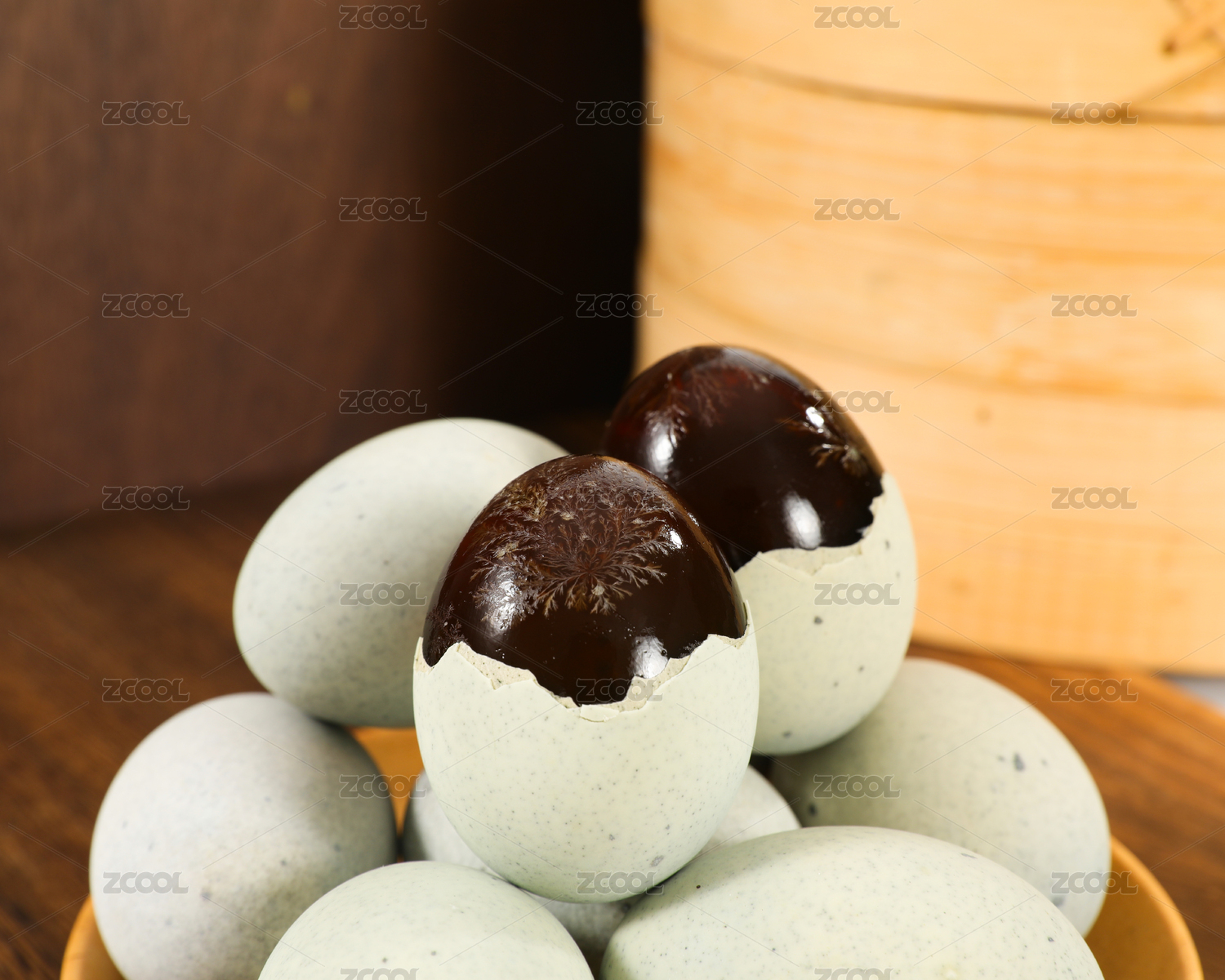切好的松花蛋盛放在碟子中摆放在黑色桌面上