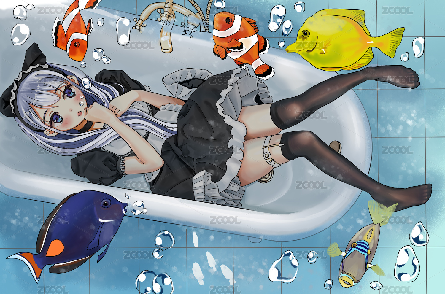 穿着蓝白色女仆装的女生在山洞里玩耍
