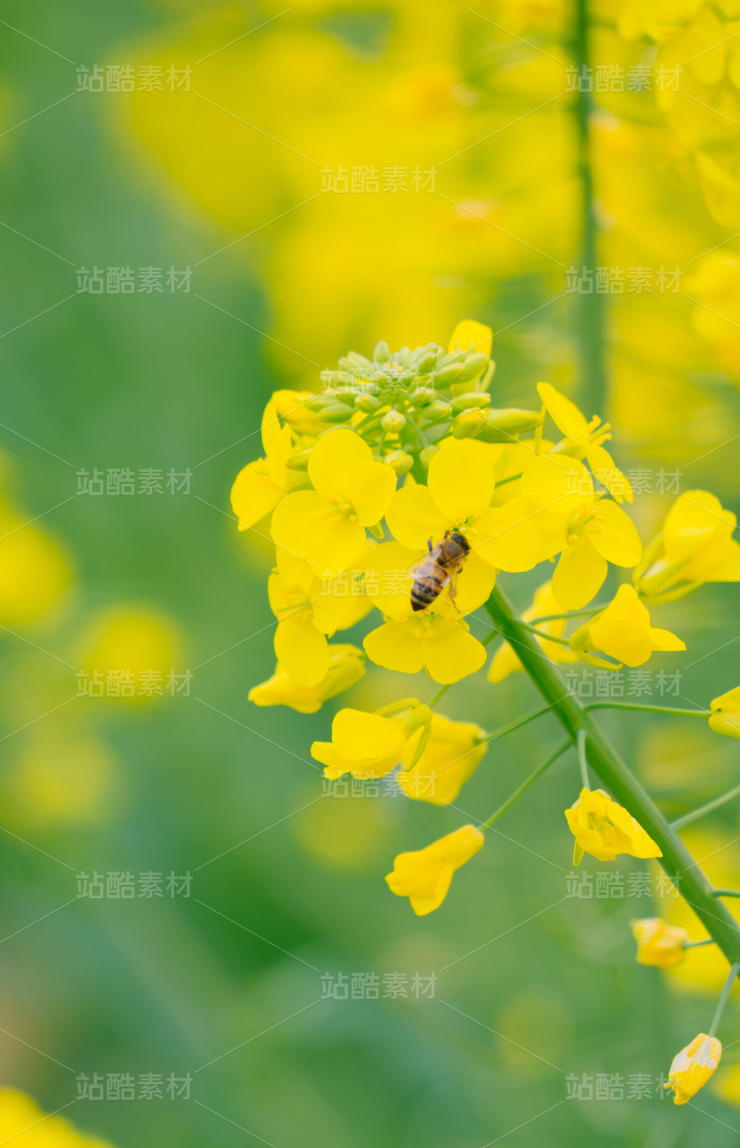 油菜花在嫩绿背景中绽放一只蜜蜂停落在花蕊间采蜜