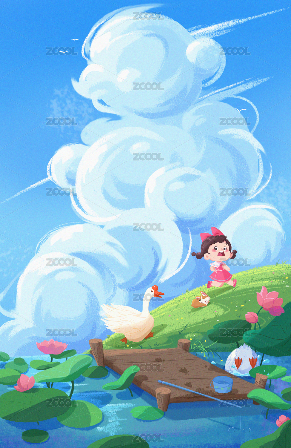 儿童插画童年被大鹅追赶钓鱼荷塘晴空