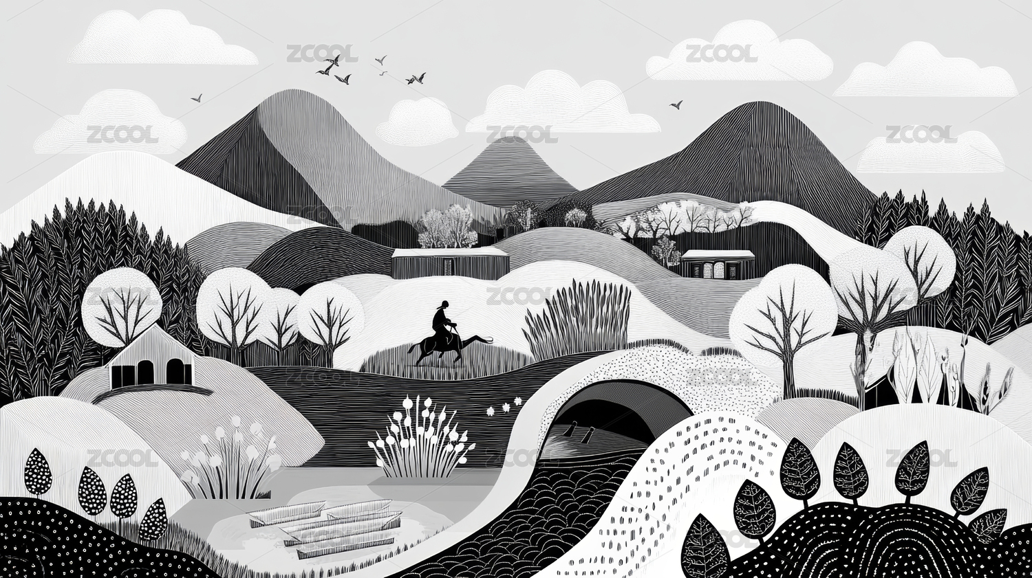 中国风水墨山水黑白风景插画