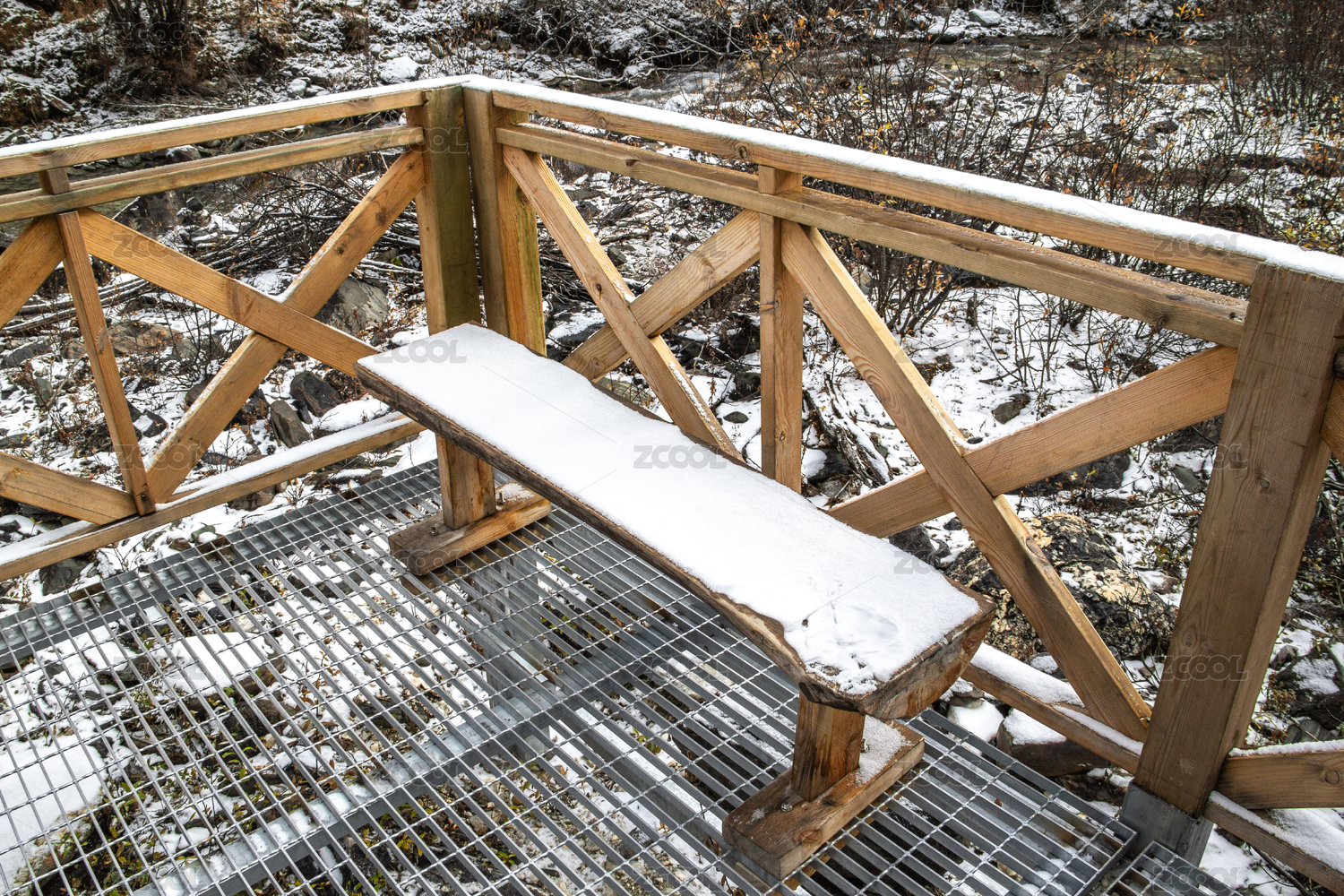 被雪覆盖的栈道木板座椅栏杆