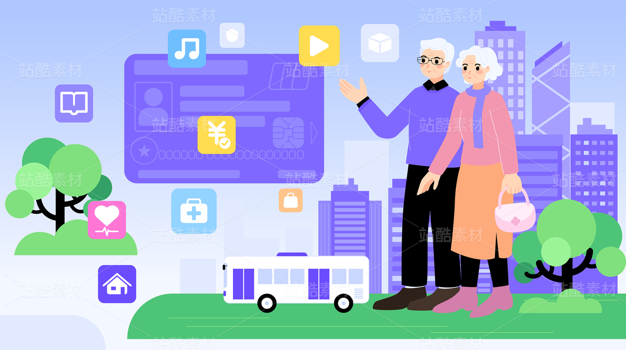 老年夫妻社保卡应用福利用途退休生活矢量插画