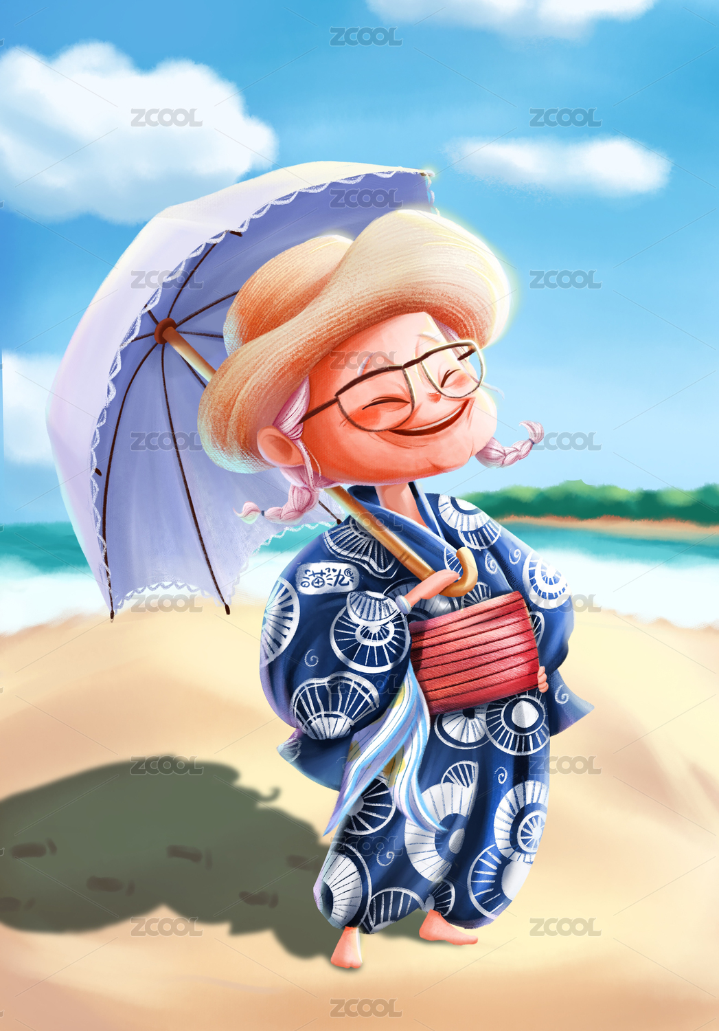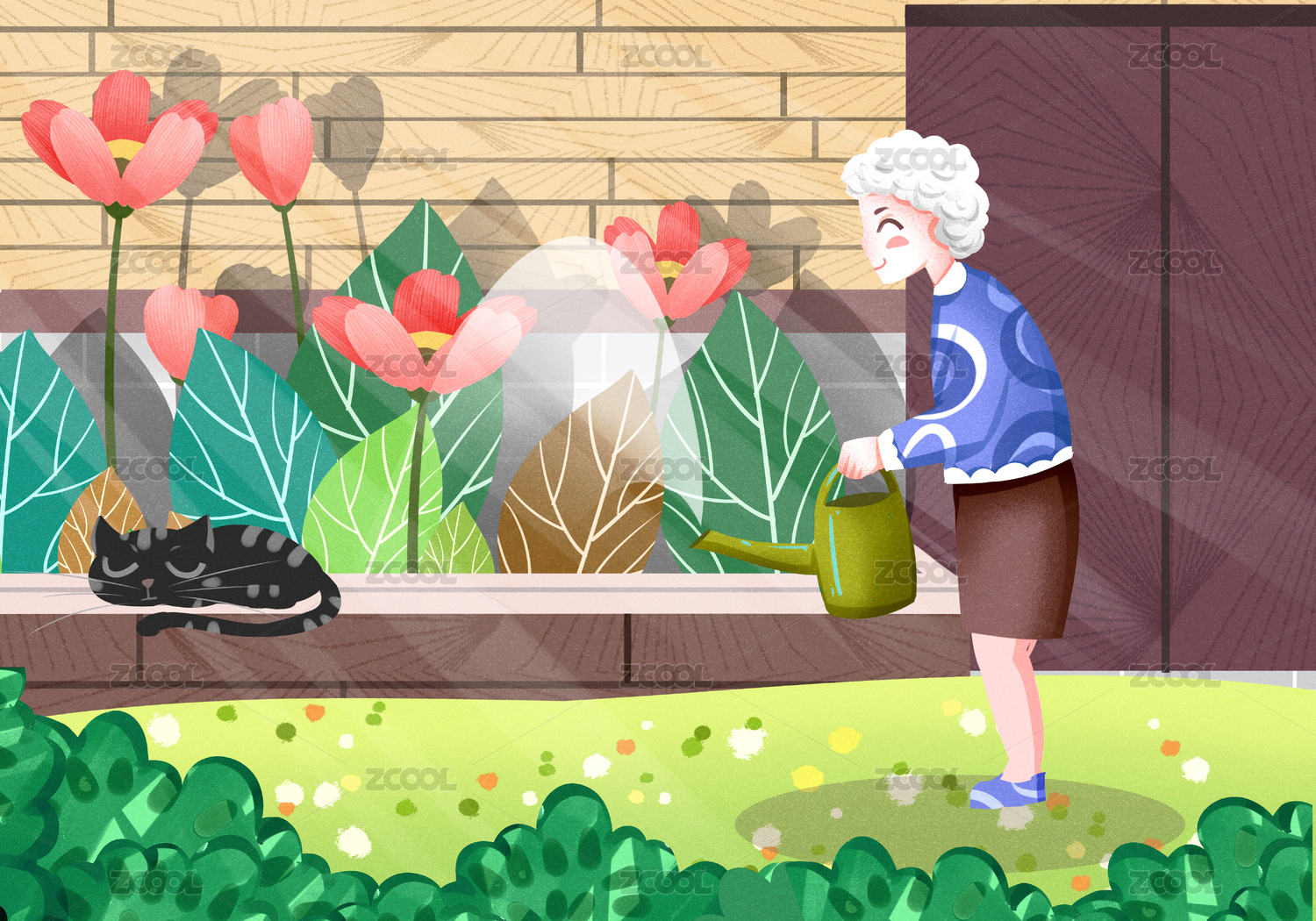 老奶奶在后花园种花浇水的惬意生活 可爱风格重阳节老年人生活插画