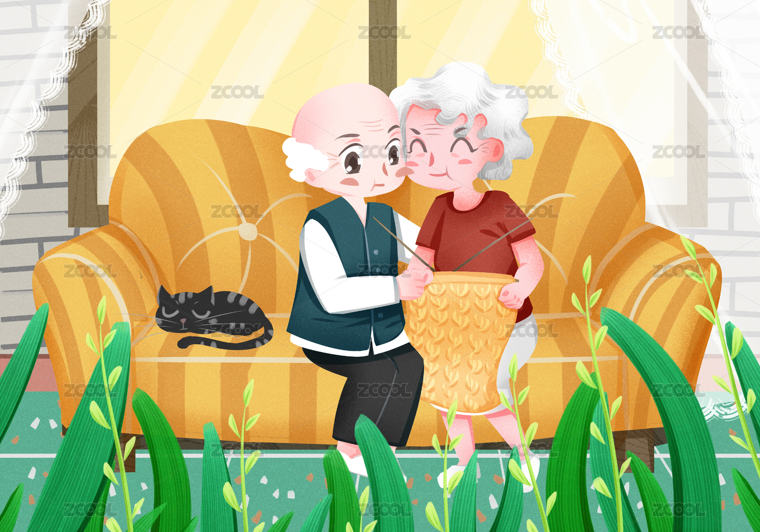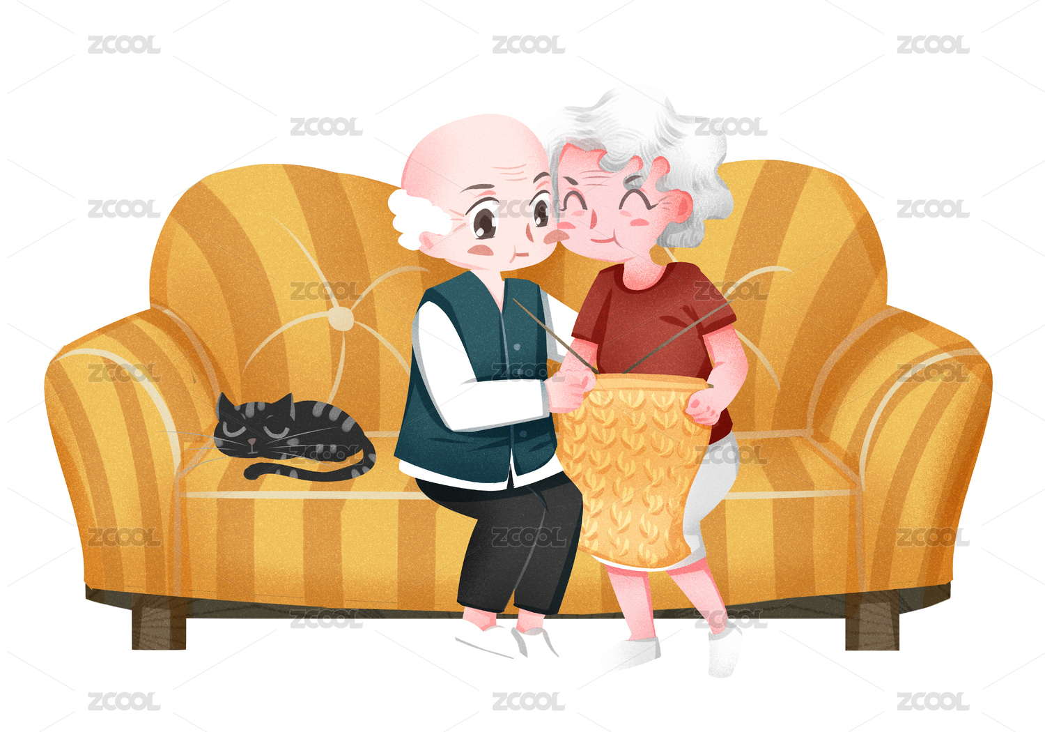 老年人夫妻在家中沙发上相拥 可爱风格重阳节老年人惬意生活插画