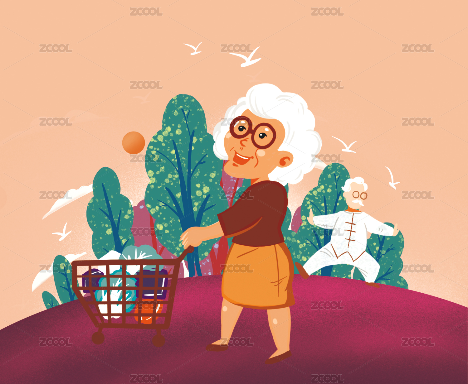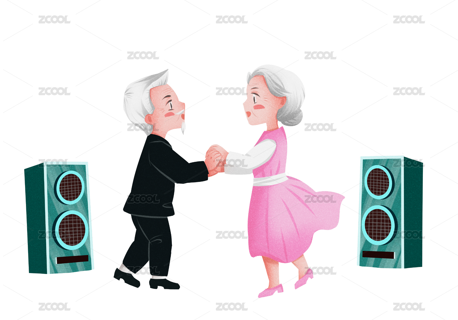 老年人夫妻跳交际舞 可爱风格重阳节老年生活插画