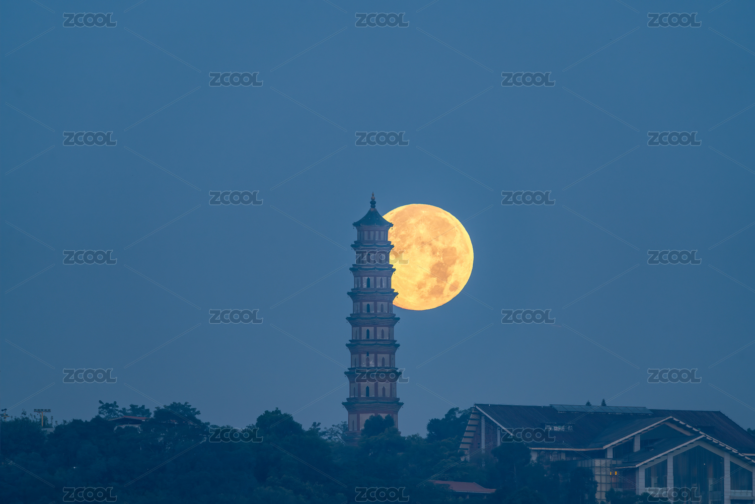 广州海鸥岛月光下的观音像古塔与圆月奇景