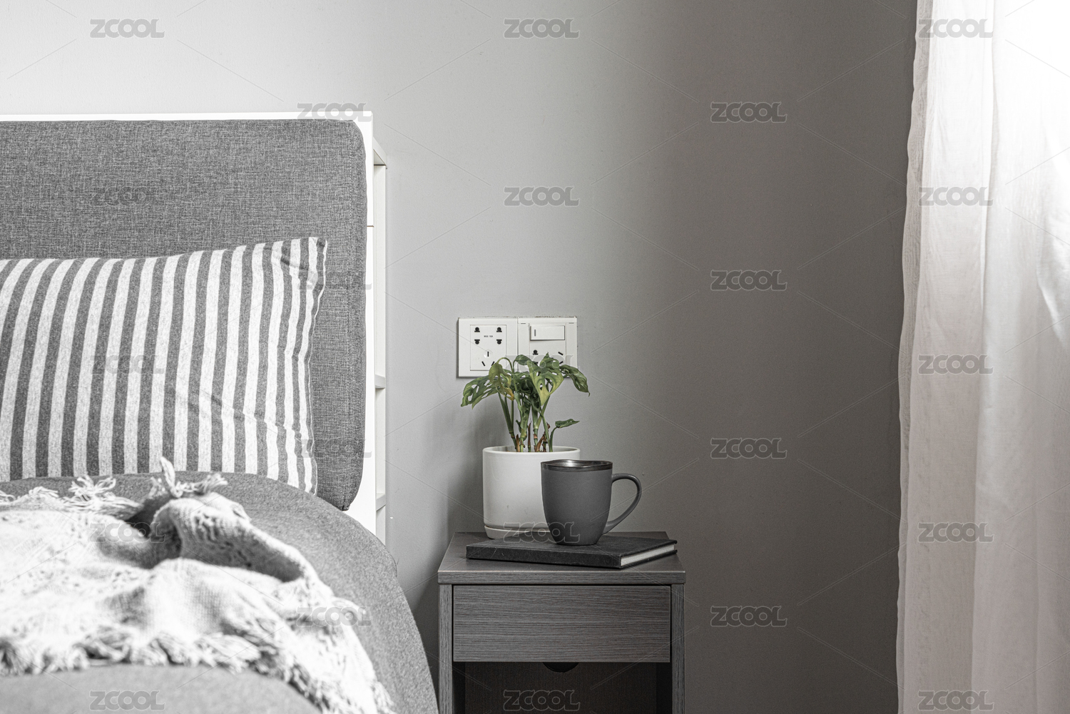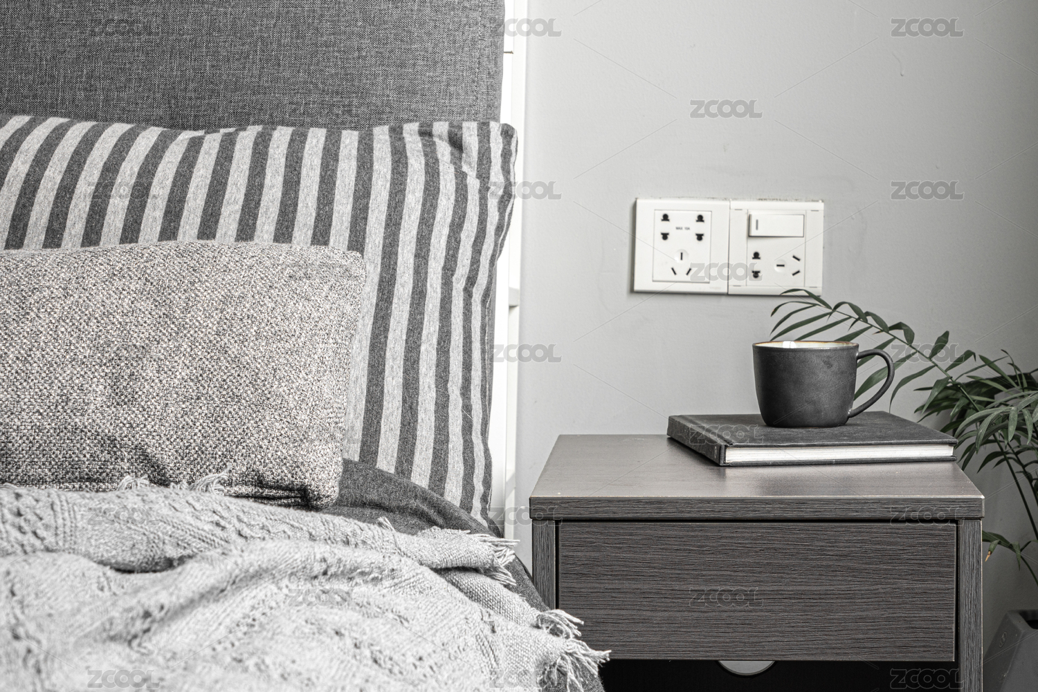 有绿植的灰色调简约卧室床头柜场景