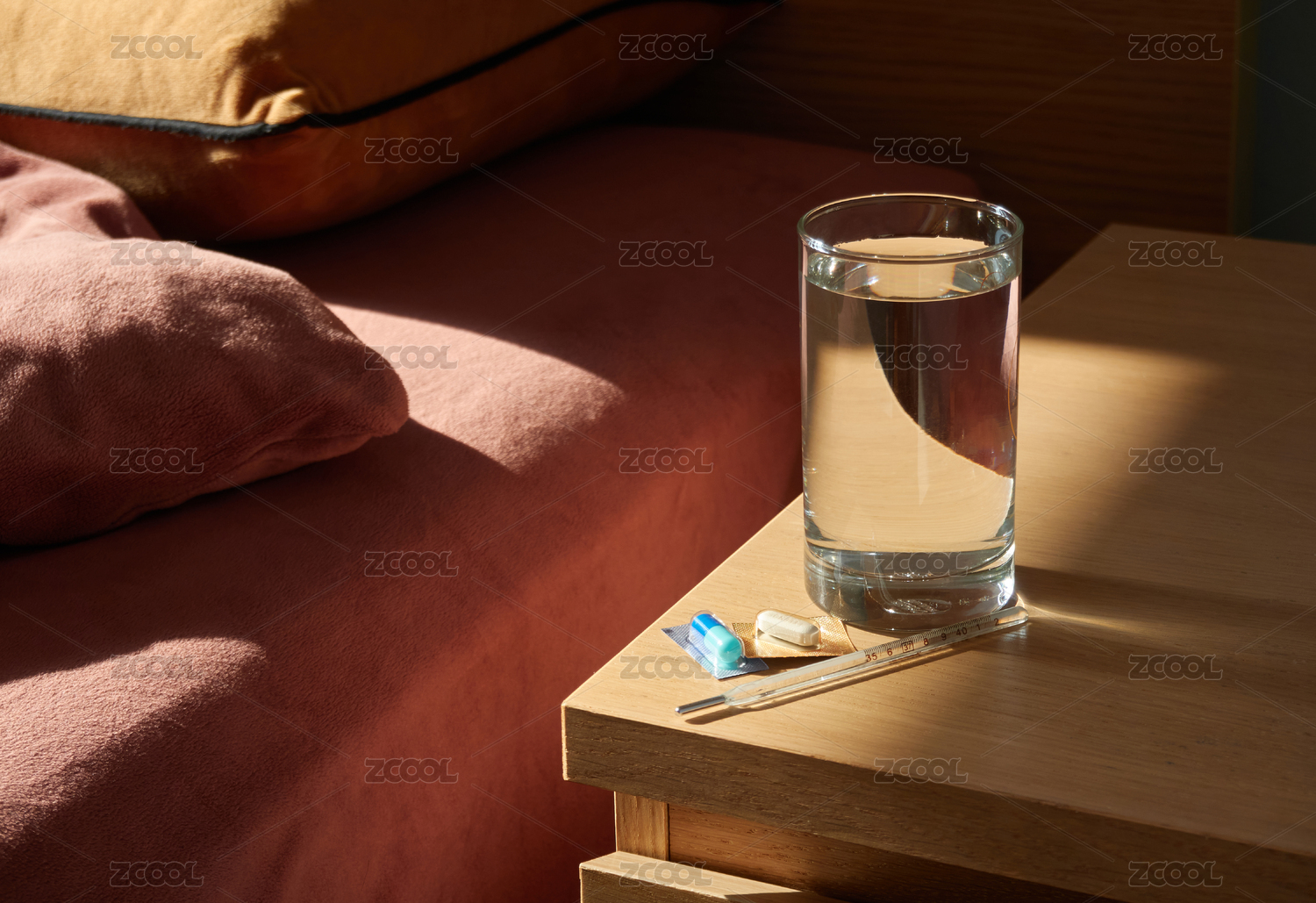 早晨放在床头柜的药、体温计和一杯水