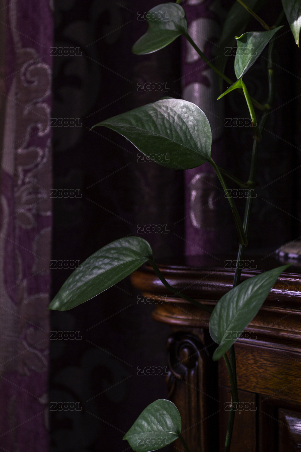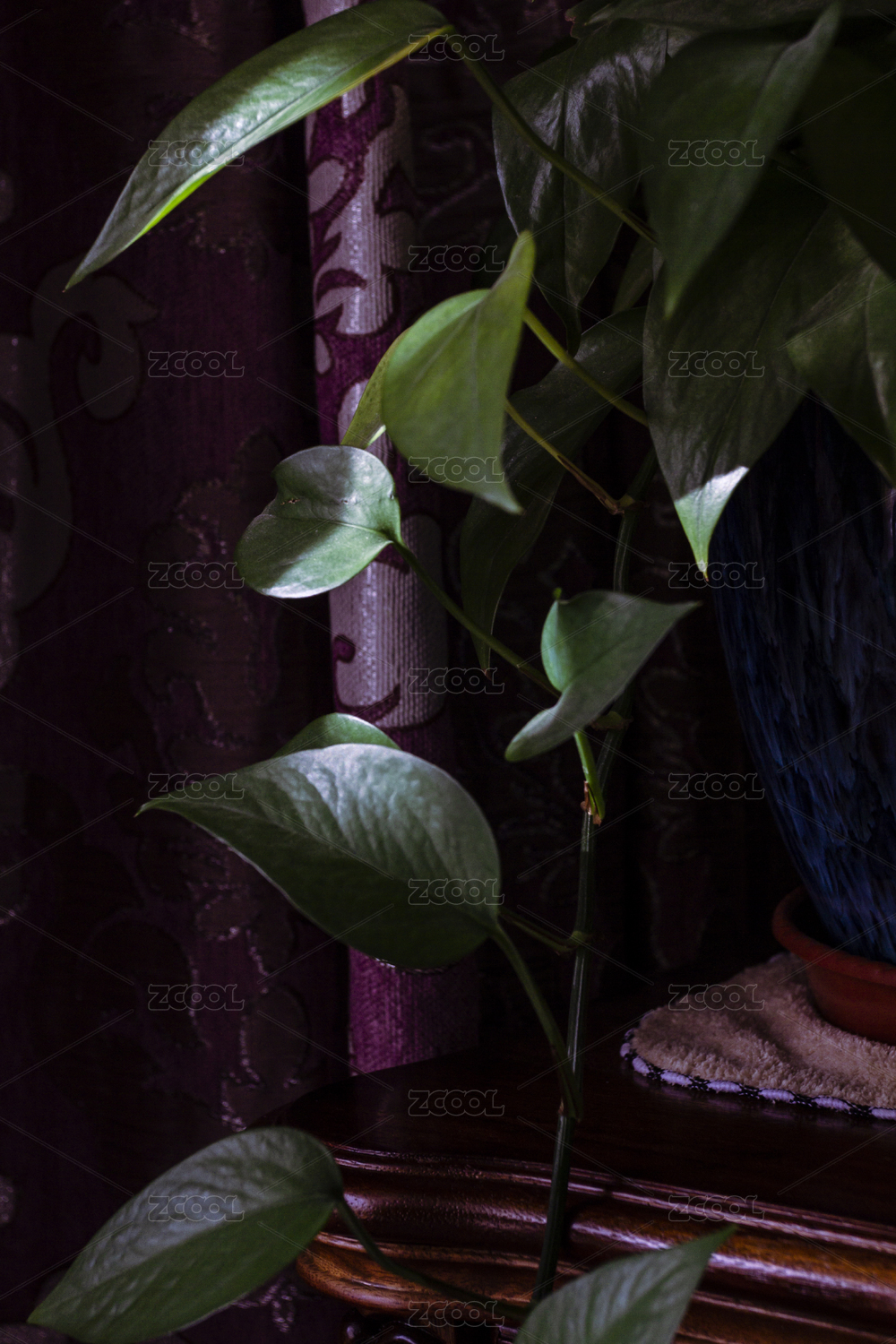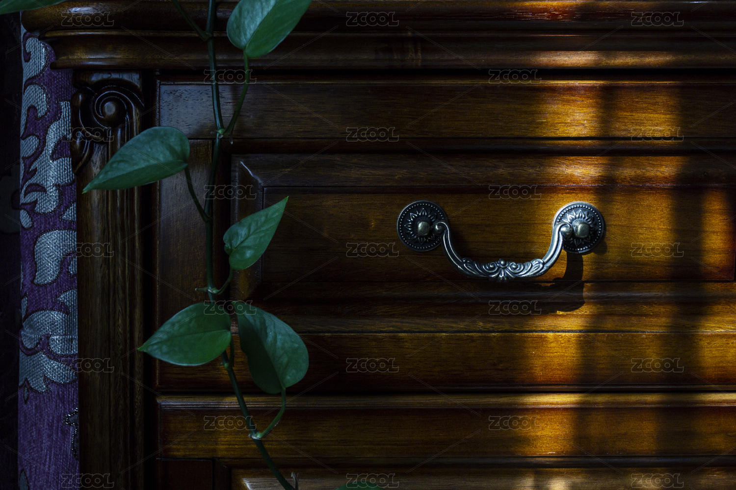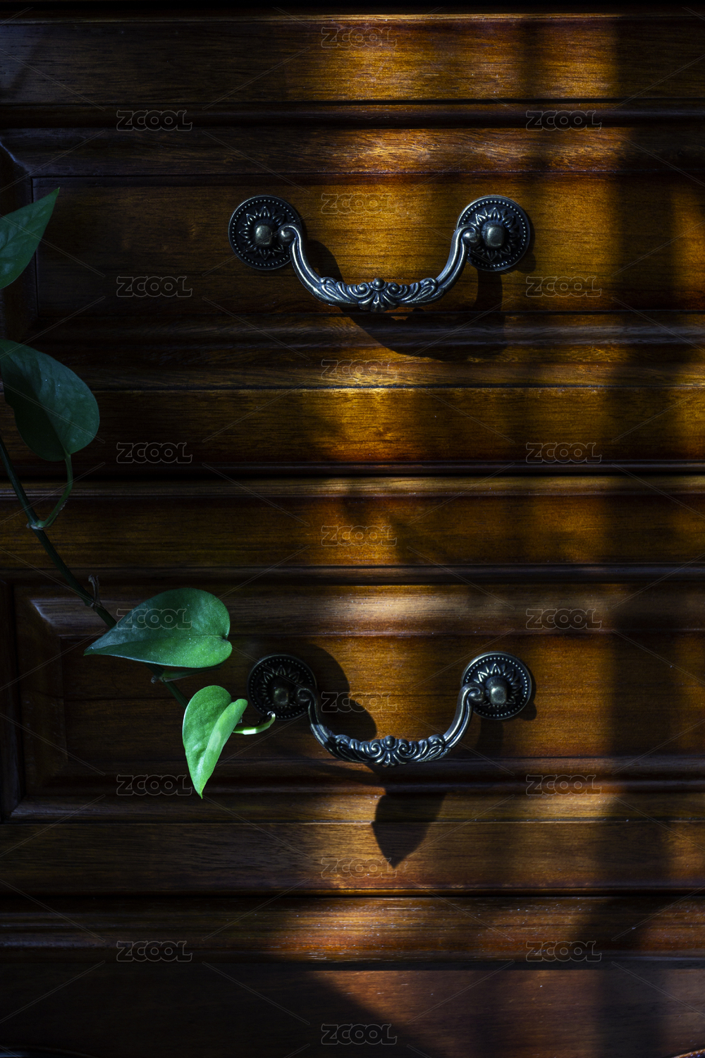 床头柜上的铁艺把手和绿色植物