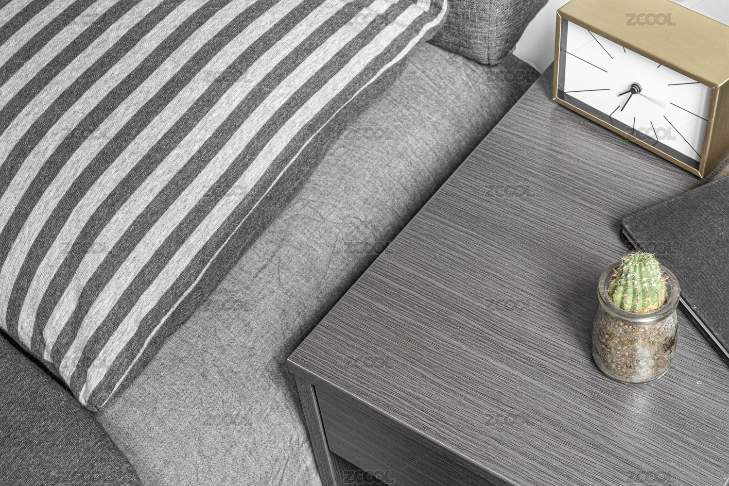 有闹钟的灰色调简约卧室床头柜场景
