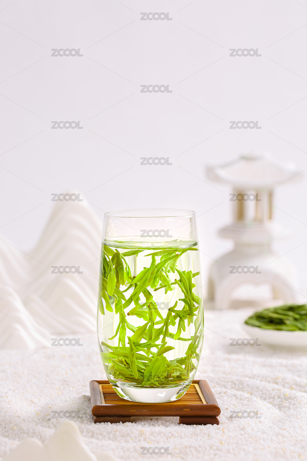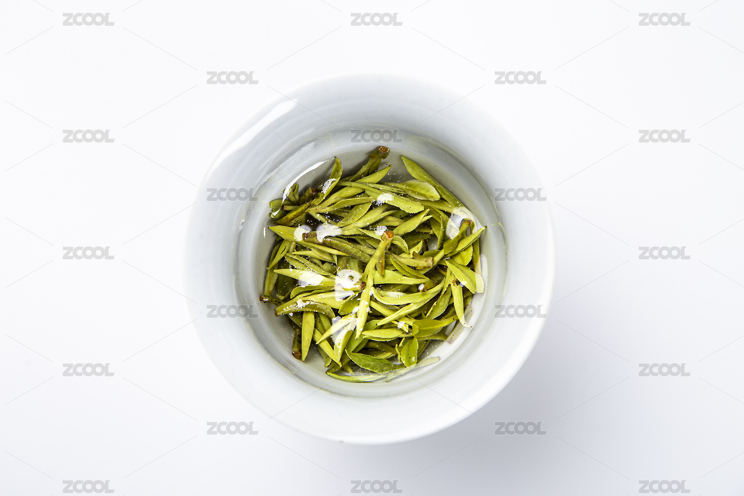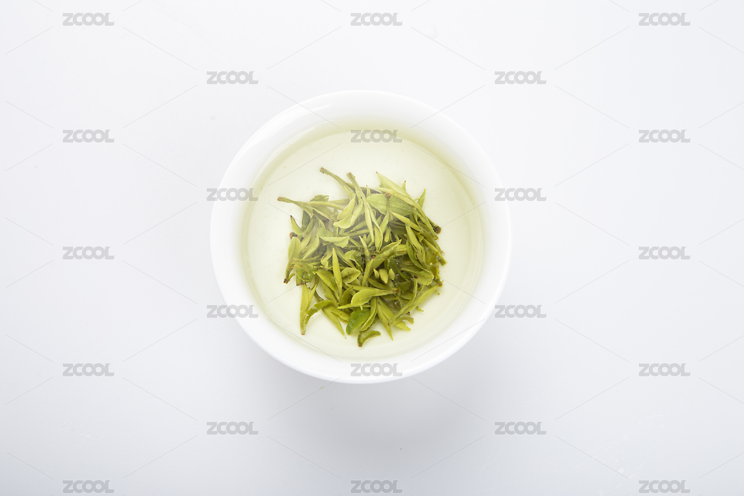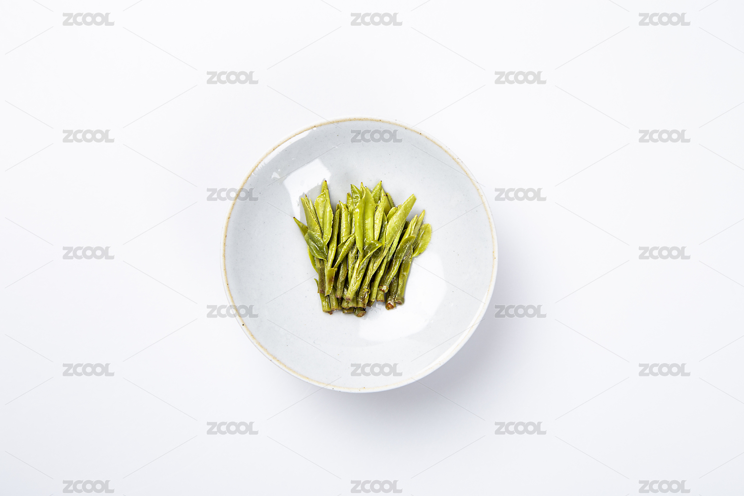 瓷小盘上面放着嫩绿色西湖龙井叶底